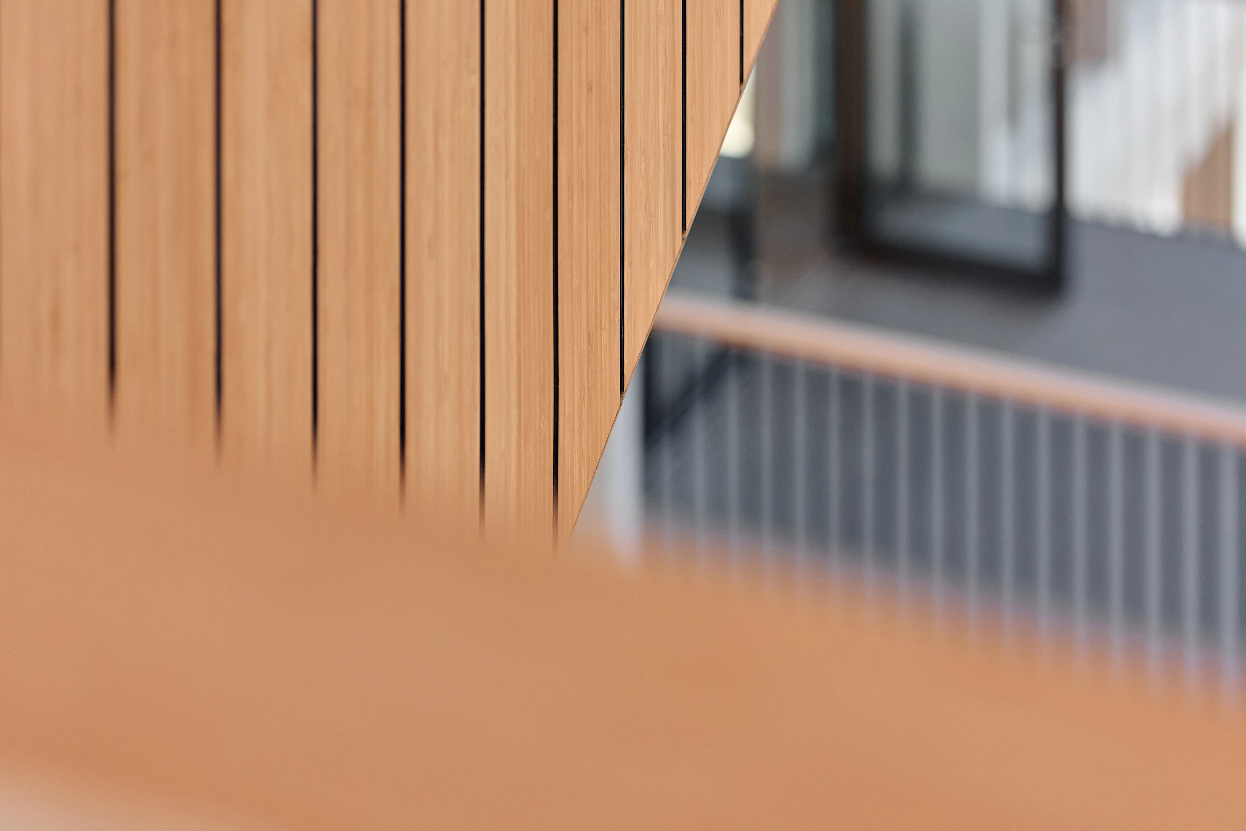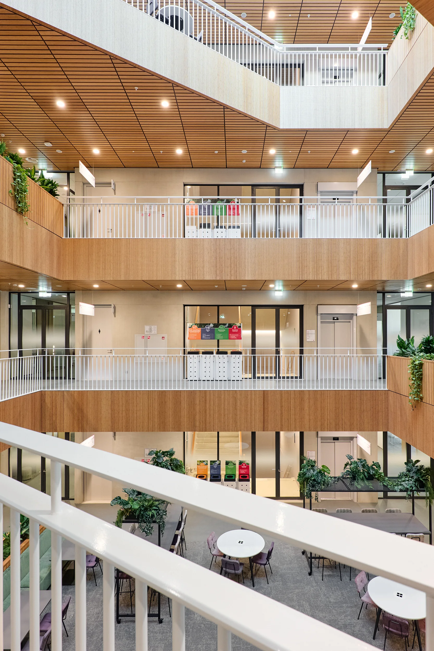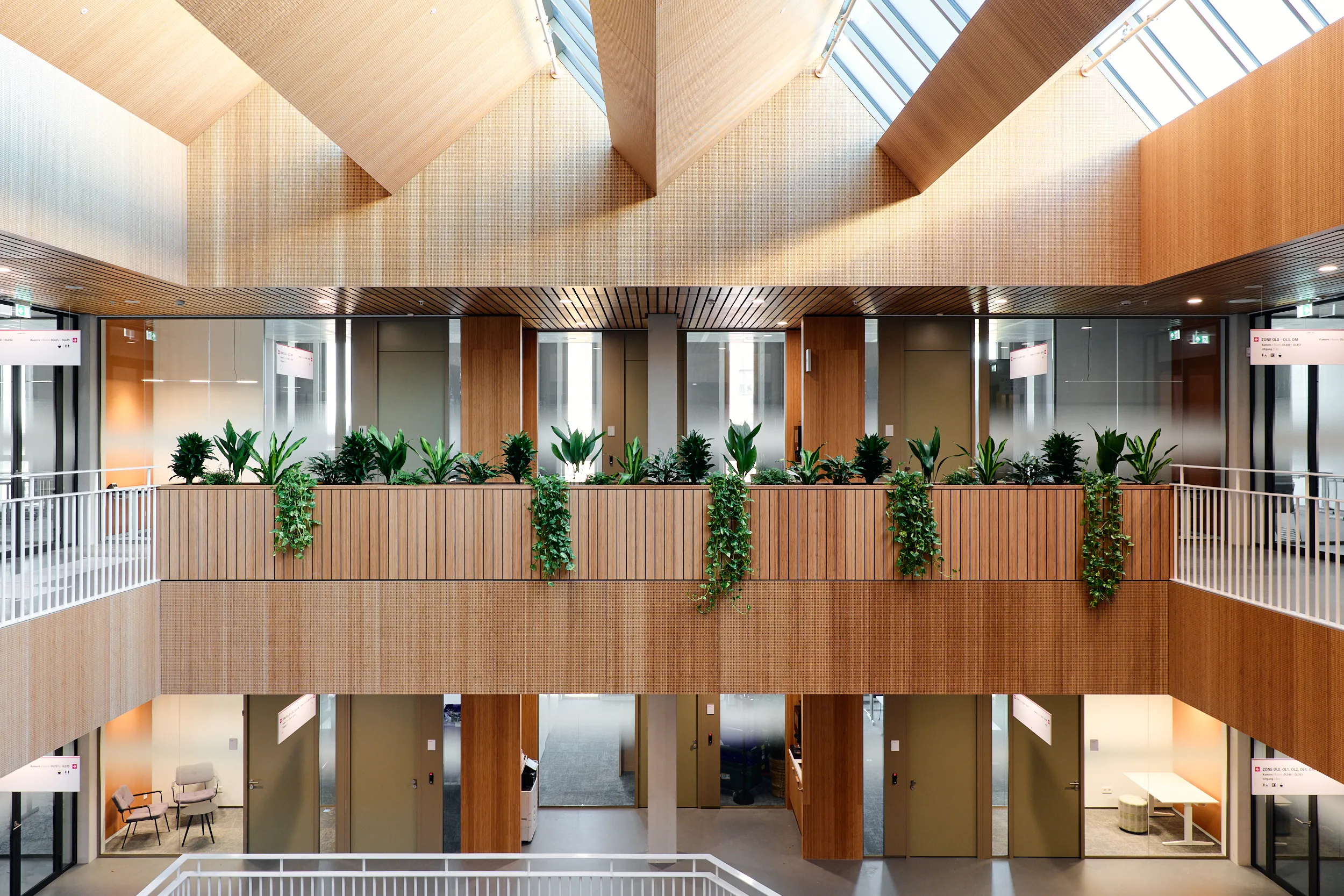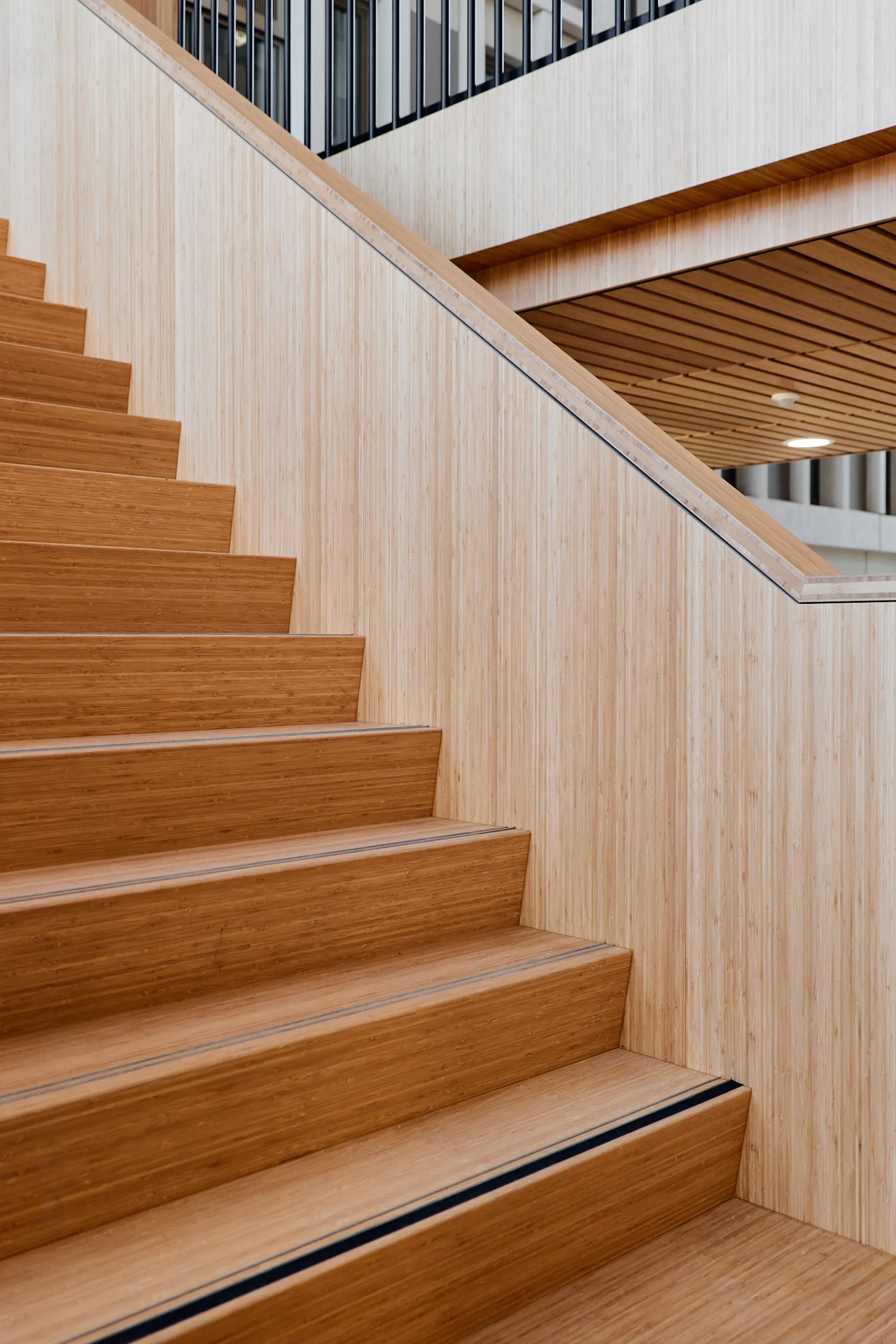 In het atrium is het vakmanschap van onze interieurbouwers duidelijk zichtbaar. De volledige wand- en trapbekleding is door ons op maat geproduceerd en zorgvuldig op locatie gemonteerd. Voor de materialisering kozen we ook hier voor massief bamboe en gefineerd plaatmateriaal. De wand- en trapbekleding is een echte eyecatcher: dynamisch, natuurlijk en tot in detail vakkundig afgewerkt.