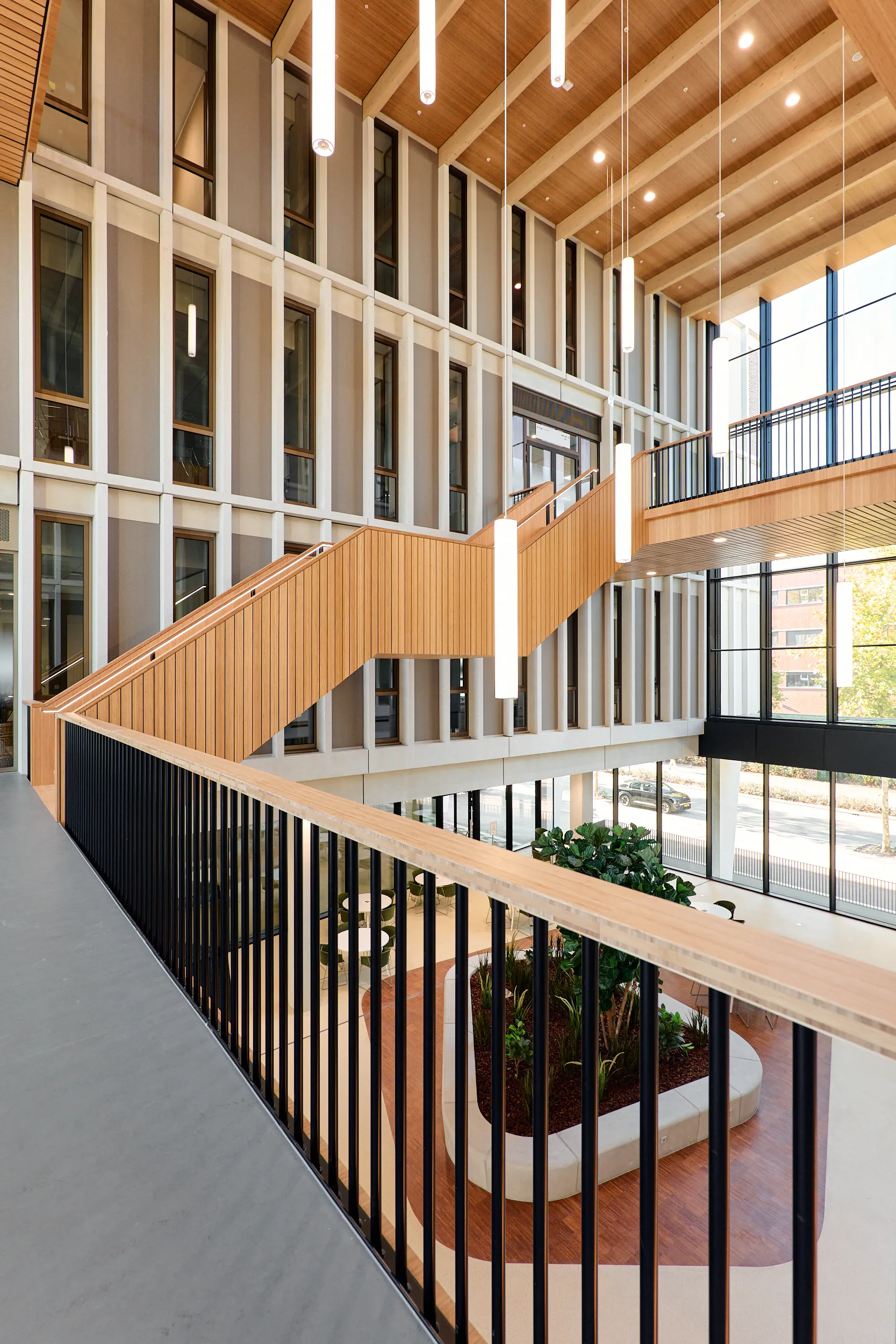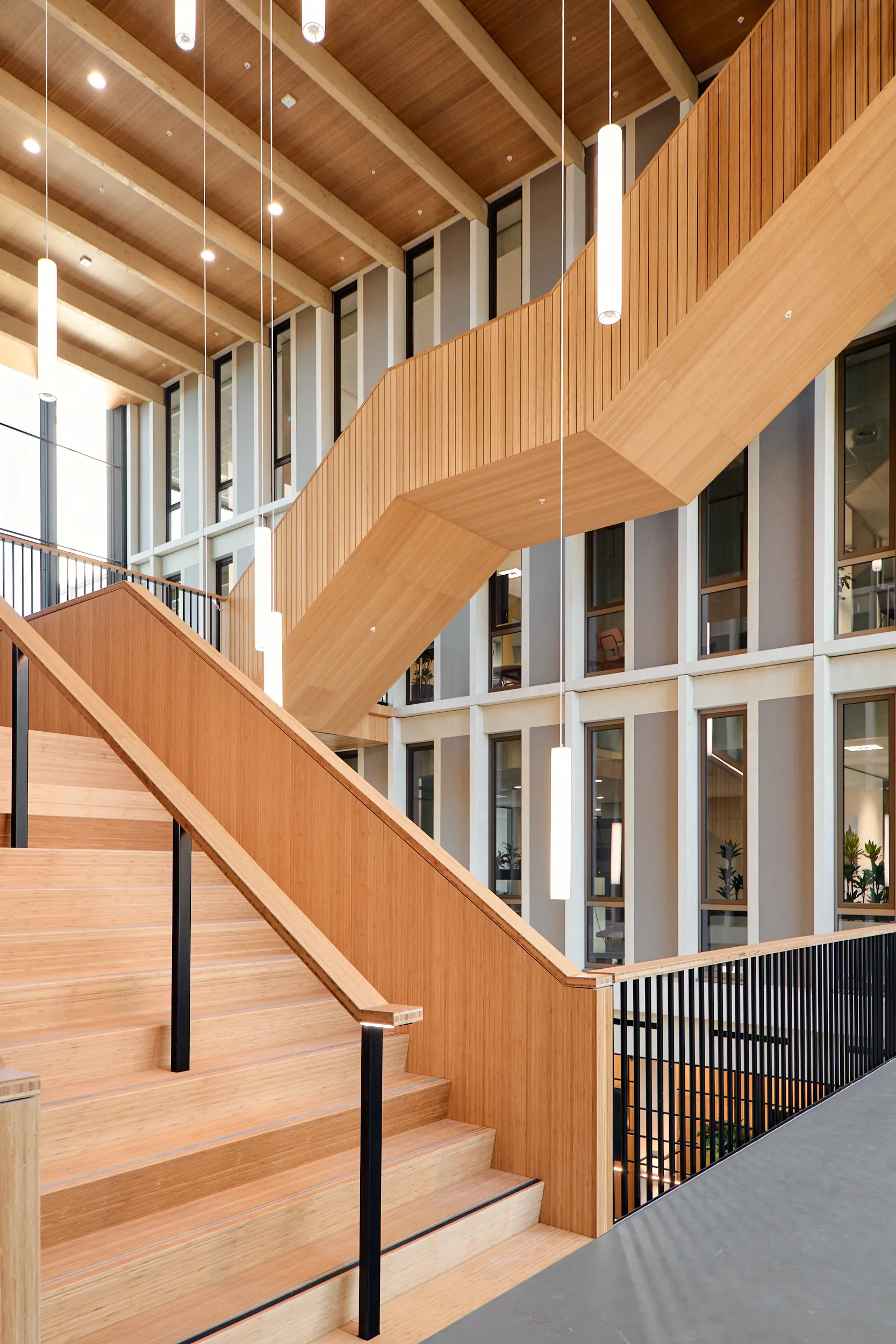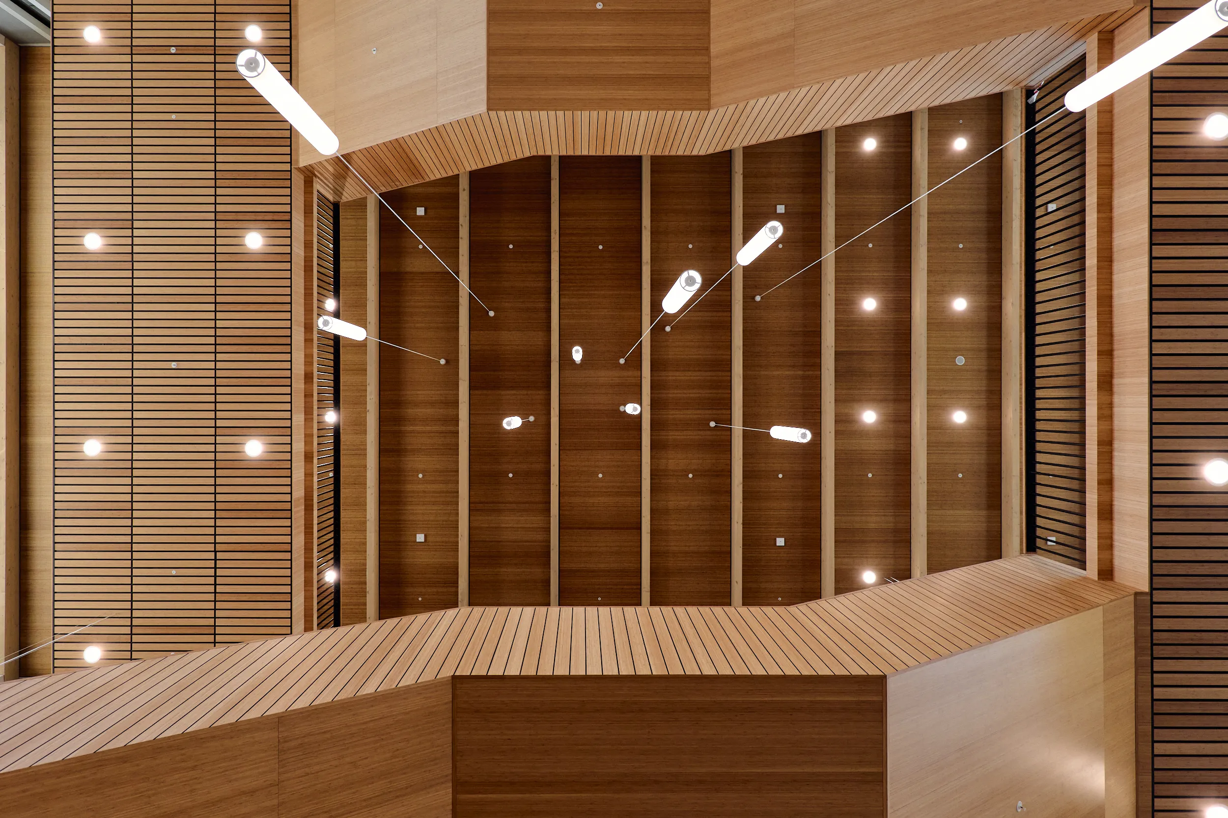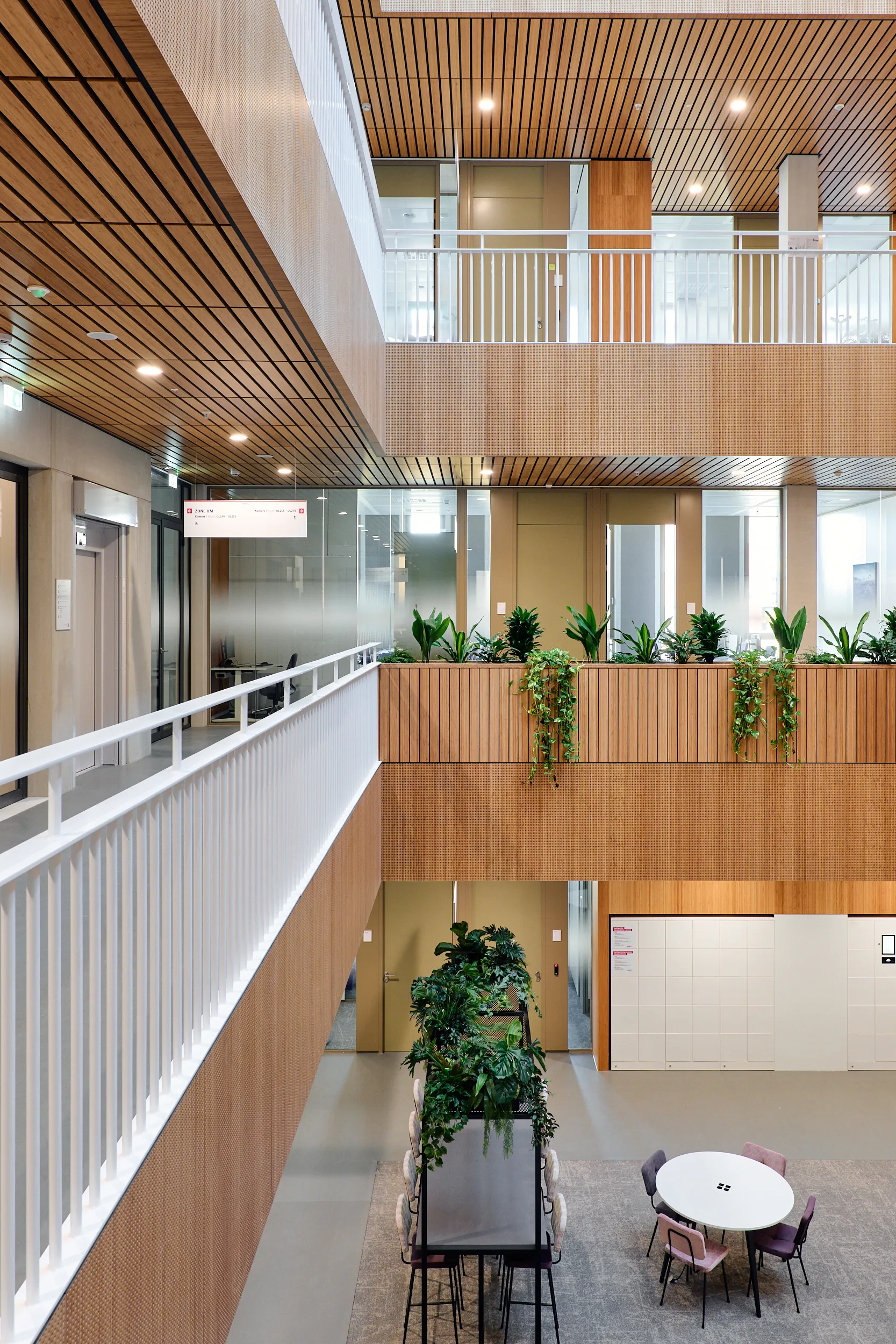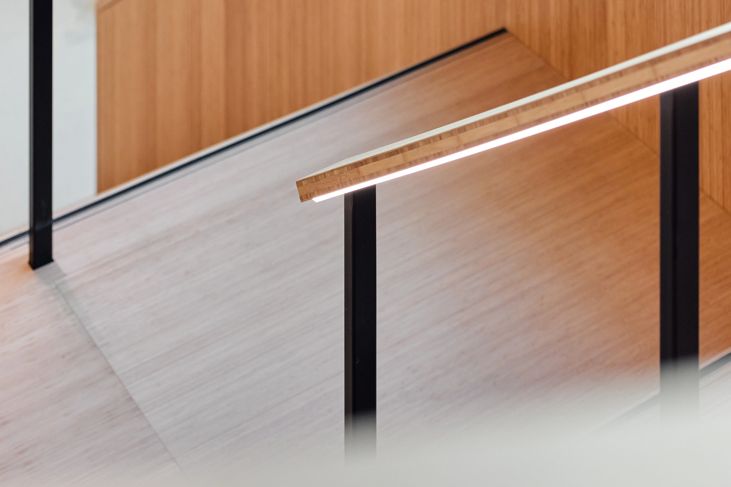 In het atrium is het vakmanschap van onze interieurbouwers duidelijk zichtbaar. De volledige wand- en trapbekleding is door ons op maat geproduceerd en zorgvuldig op locatie gemonteerd. Voor de materialisering kozen we ook hier voor massief bamboe en gefineerd plaatmateriaal. De wand- en trapbekleding is een echte eyecatcher: dynamisch, natuurlijk en tot in detail vakkundig afgewerkt.