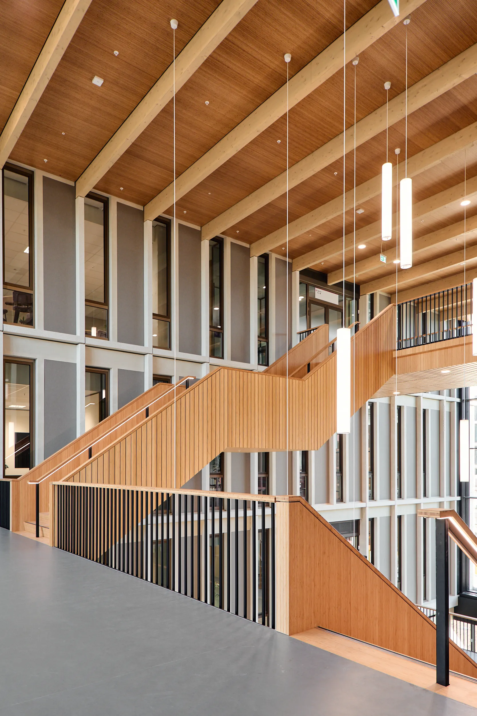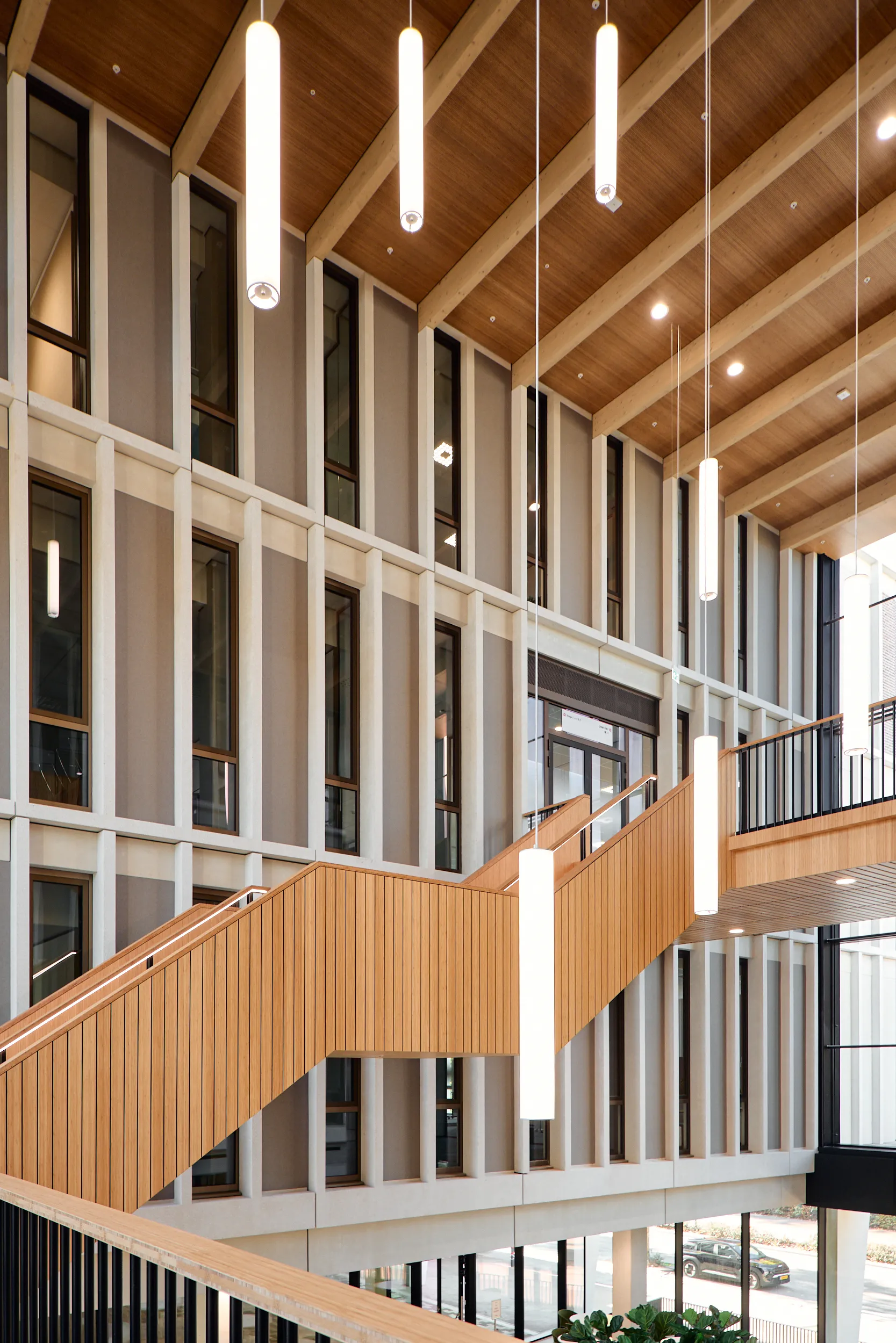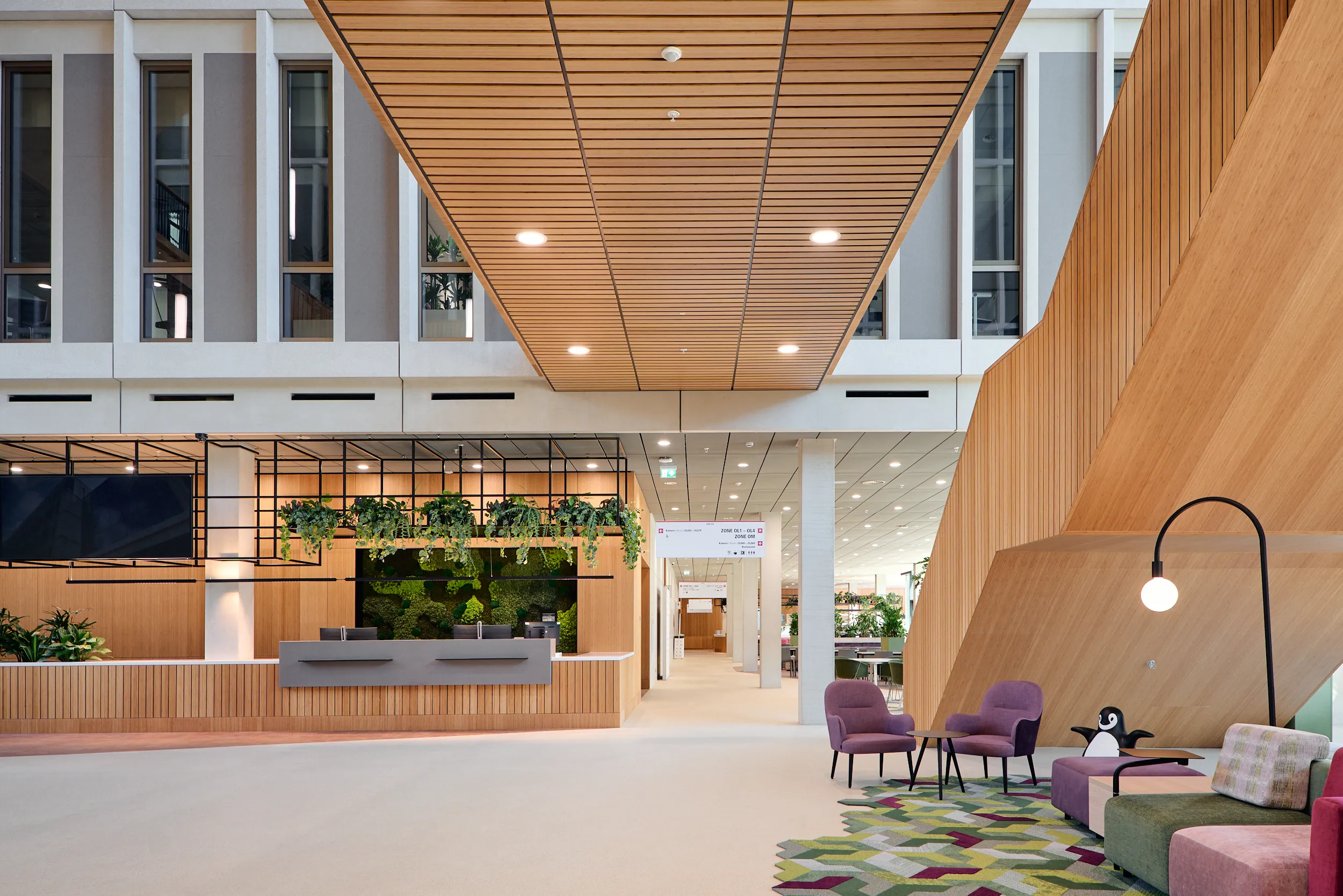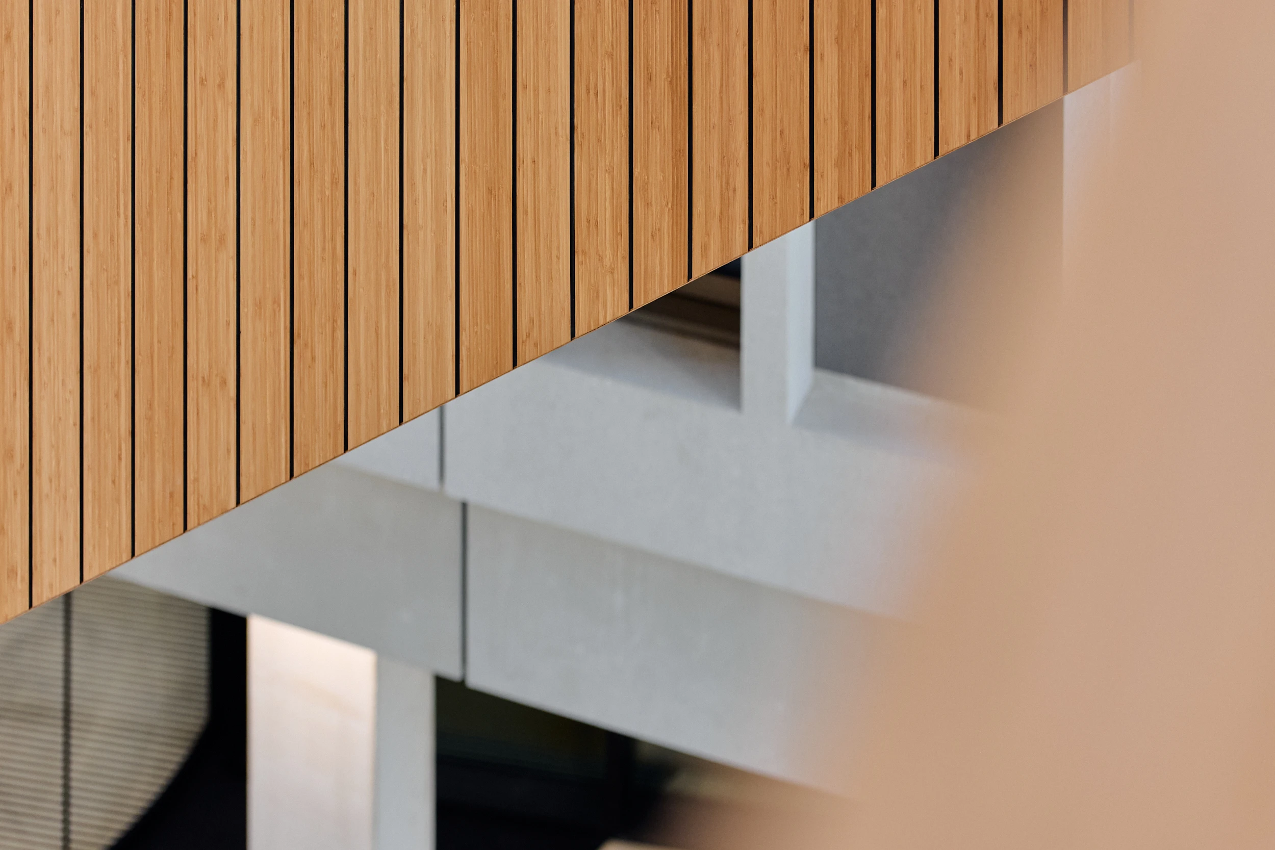 In het atrium is het vakmanschap van onze interieurbouwers duidelijk zichtbaar. De volledige wand- en trapbekleding is door ons op maat geproduceerd en zorgvuldig op locatie gemonteerd. Voor de materialisering kozen we ook hier voor massief bamboe en gefineerd plaatmateriaal. De wand- en trapbekleding is een echte eyecatcher: dynamisch, natuurlijk en tot in detail vakkundig afgewerkt.