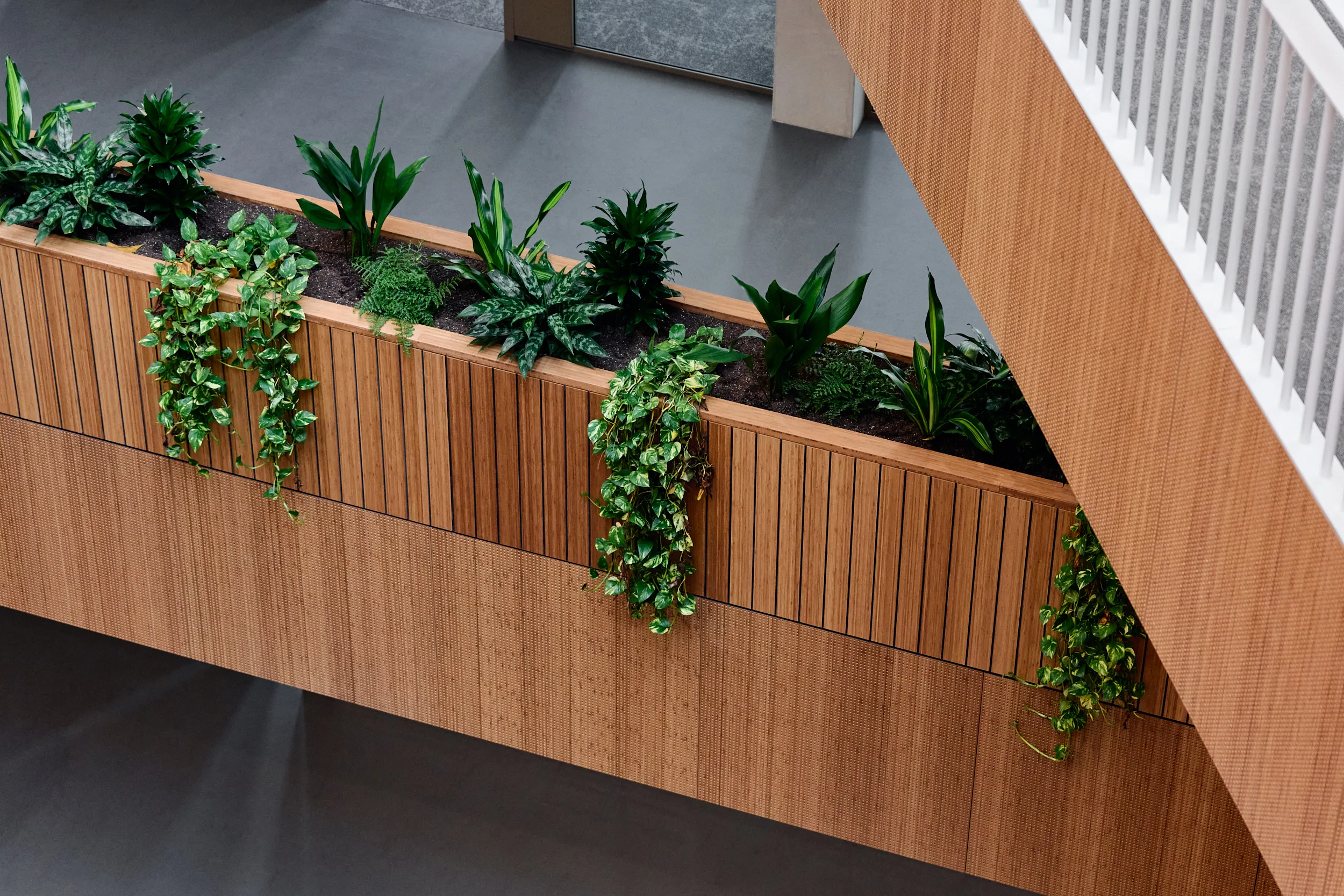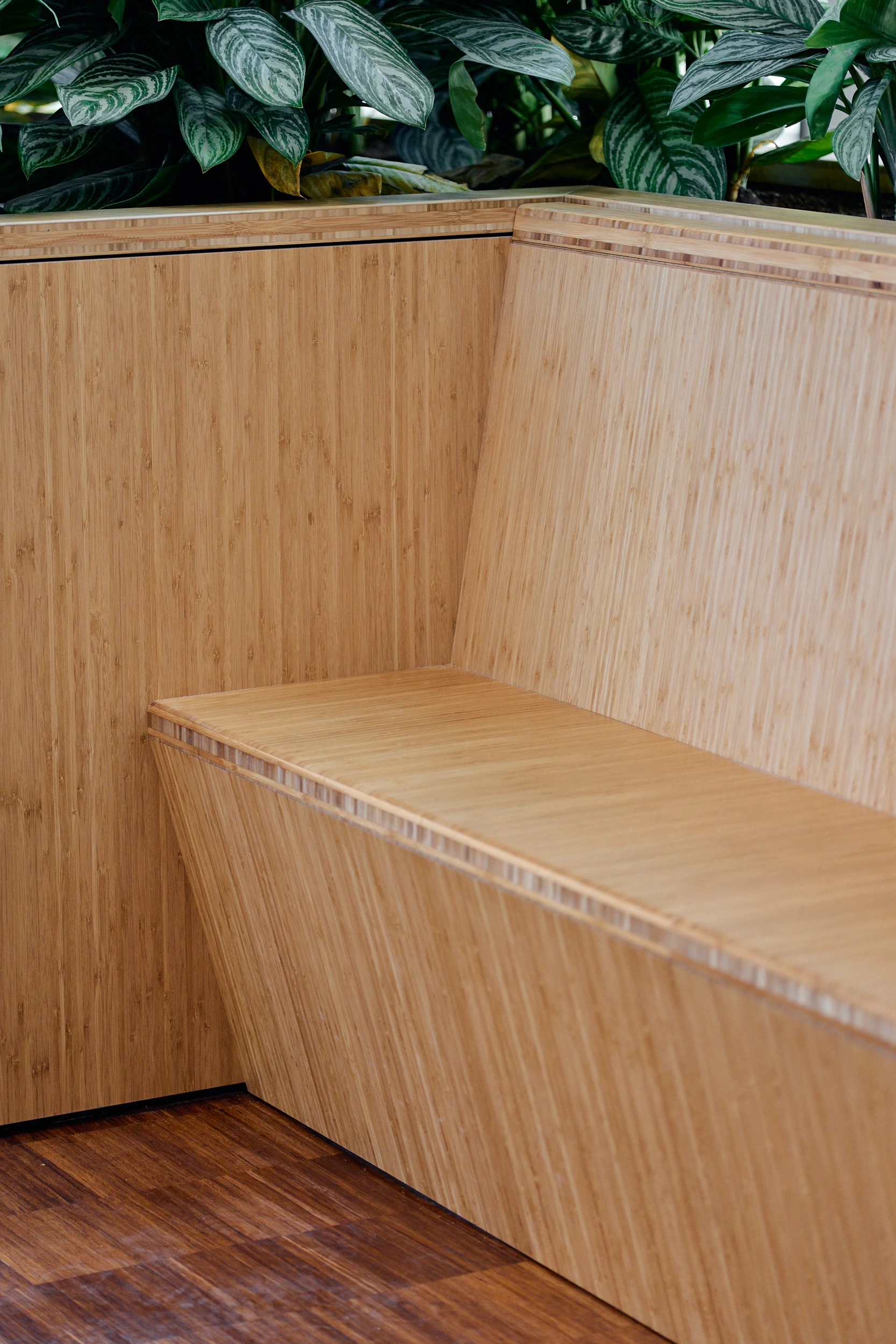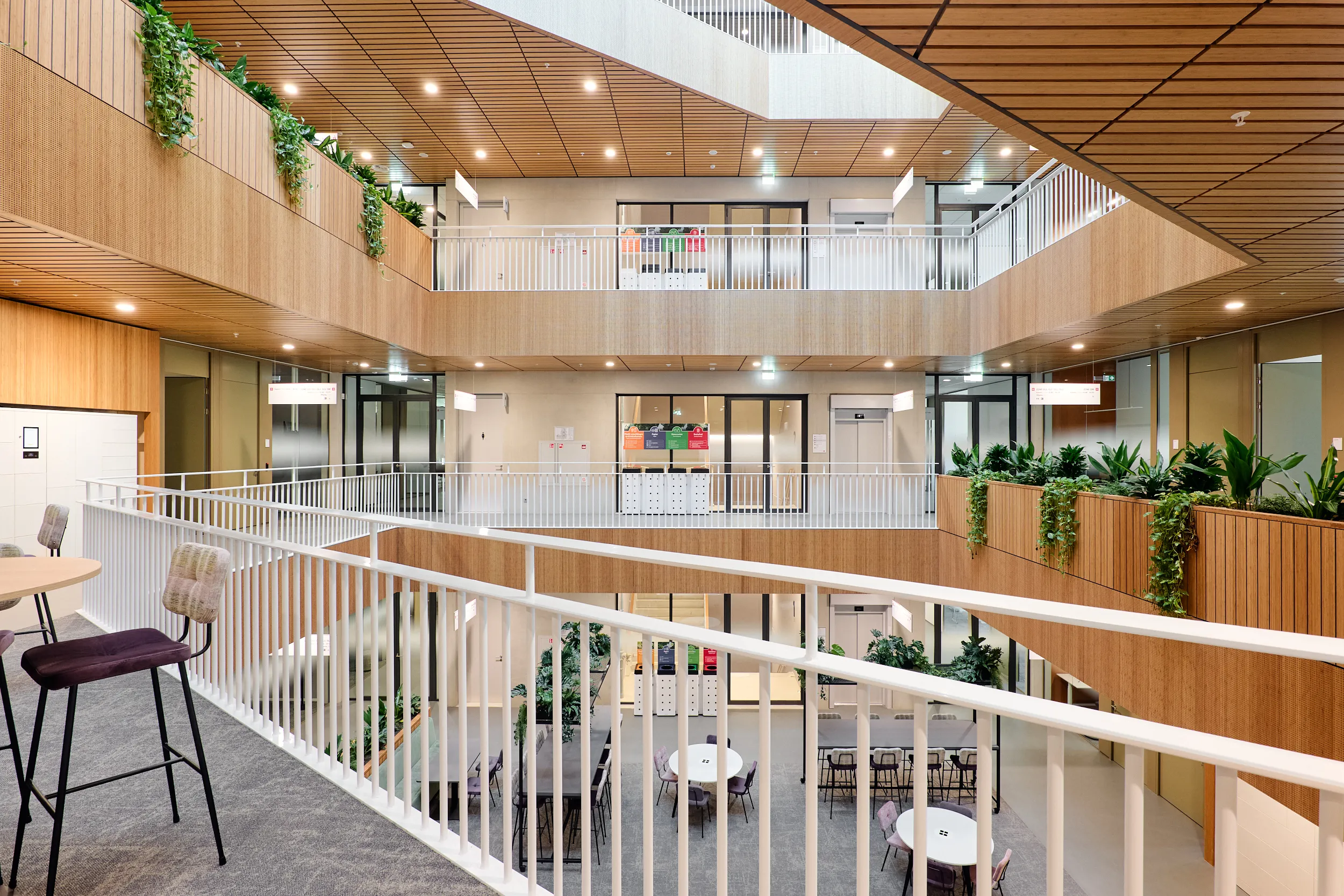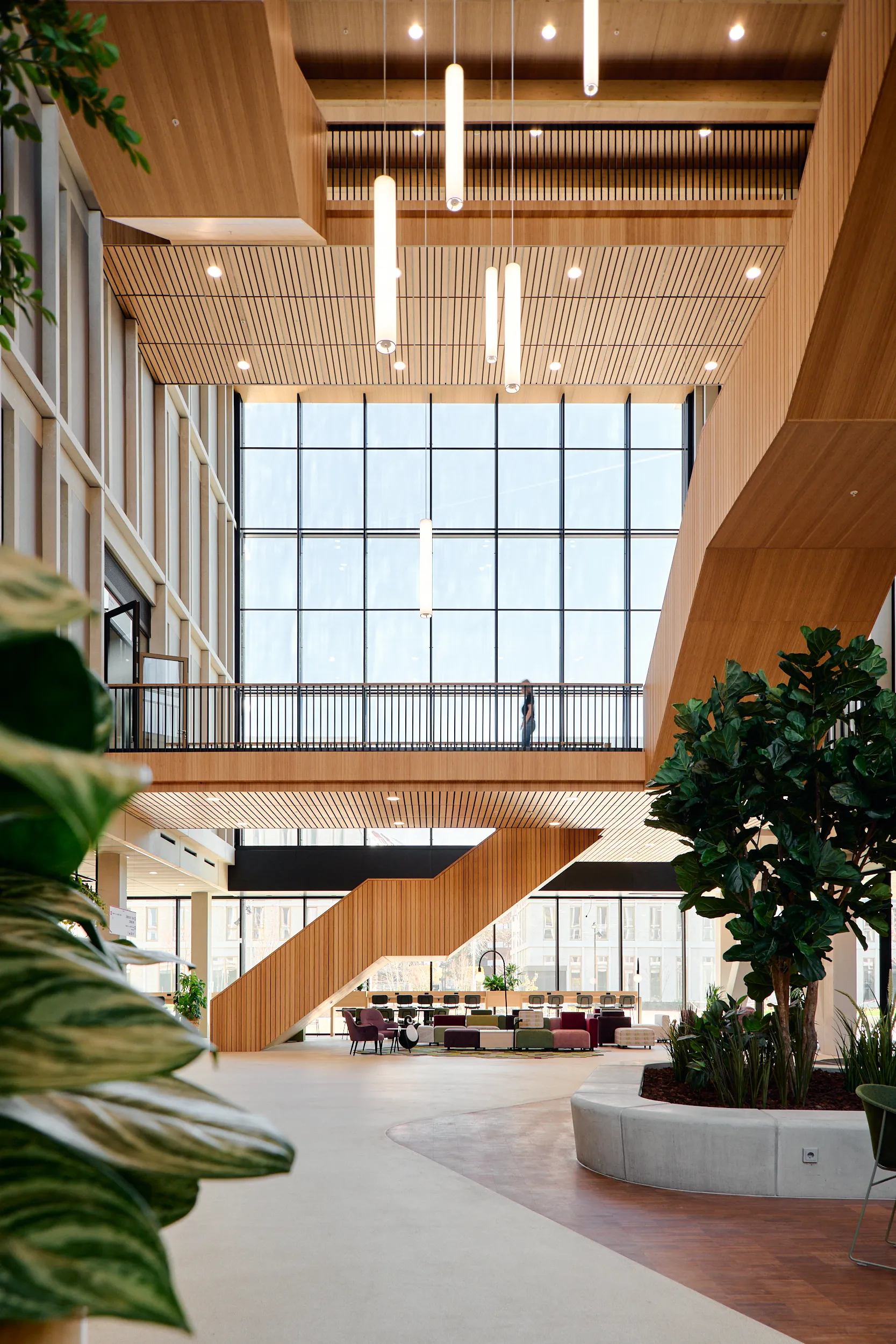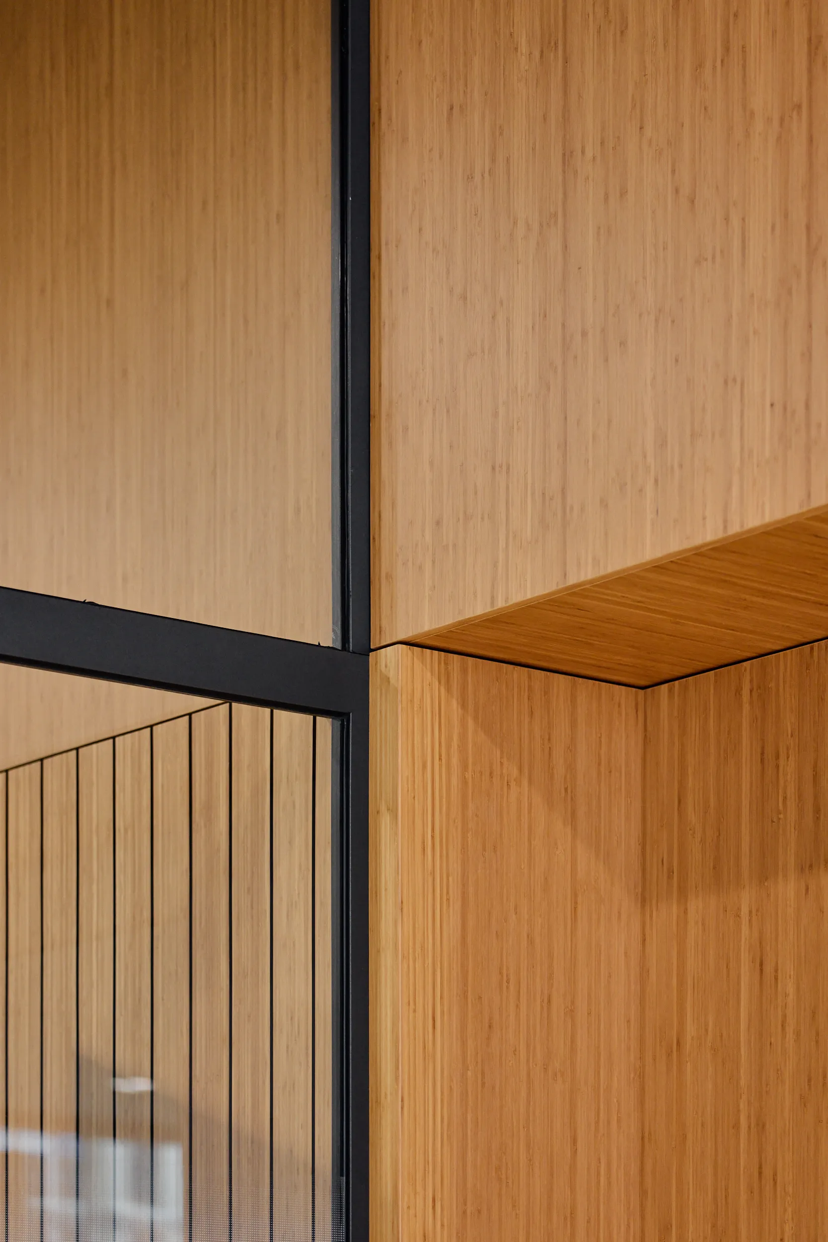 In het atrium is het vakmanschap van onze interieurbouwers duidelijk zichtbaar. De volledige wand- en trapbekleding is door ons op maat geproduceerd en zorgvuldig op locatie gemonteerd. Voor de materialisering kozen we ook hier voor massief bamboe en gefineerd plaatmateriaal. De wand- en trapbekleding is een echte eyecatcher: dynamisch, natuurlijk en tot in detail vakkundig afgewerkt.