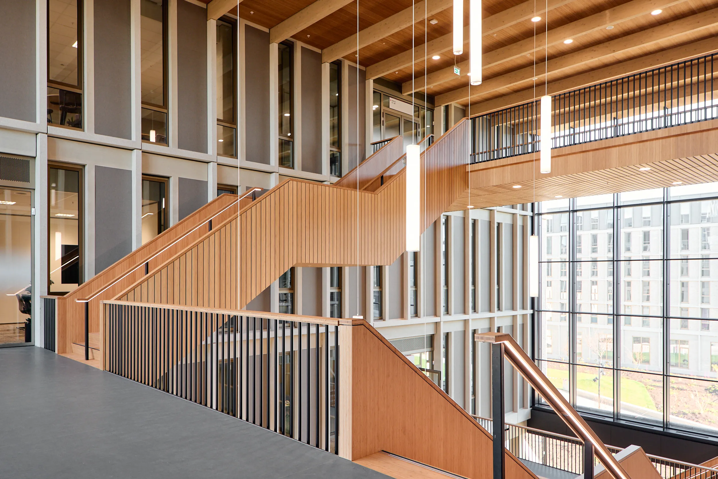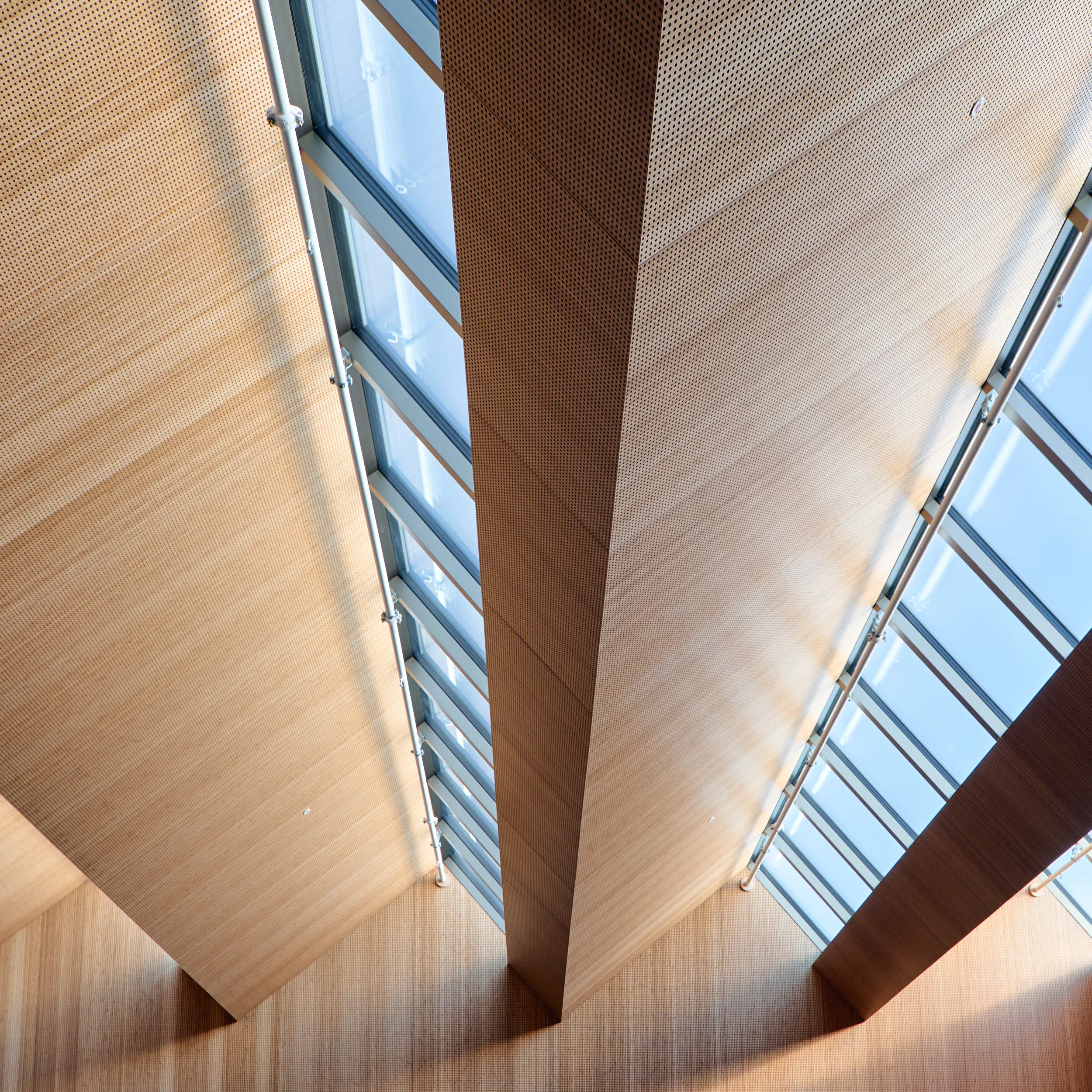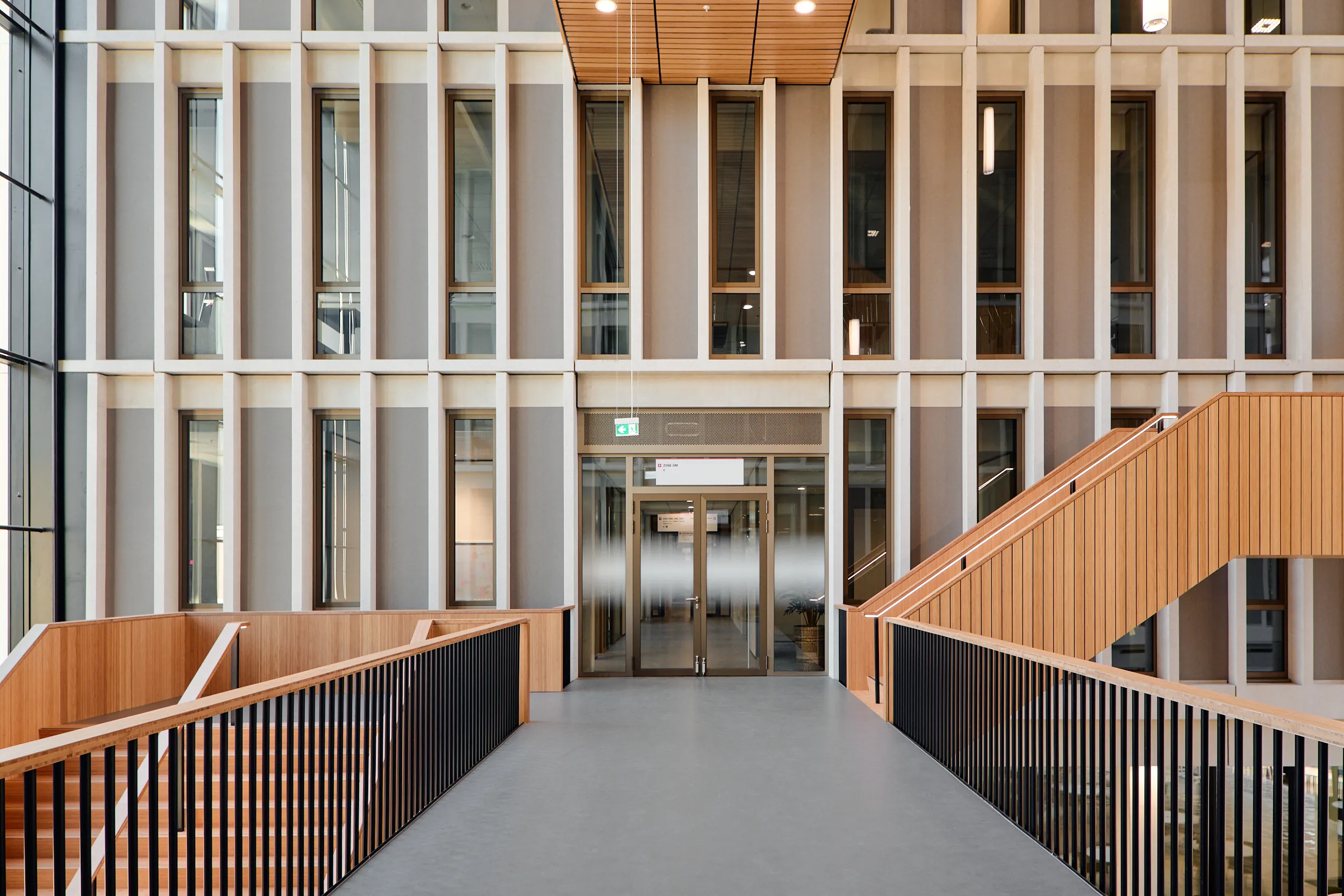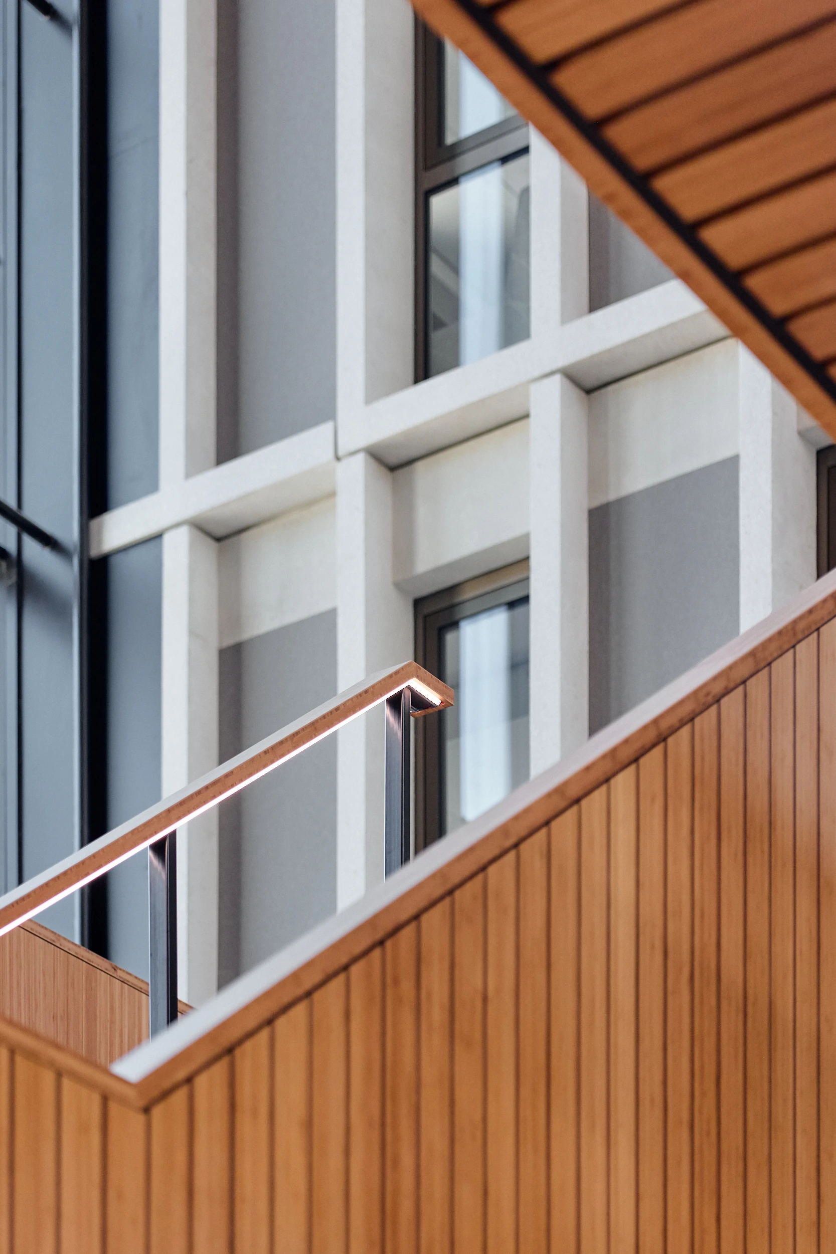 In het atrium is het vakmanschap van onze interieurbouwers duidelijk zichtbaar. De volledige wand- en trapbekleding is door ons op maat geproduceerd en zorgvuldig op locatie gemonteerd. Voor de materialisering kozen we ook hier voor massief bamboe en gefineerd plaatmateriaal. De wand- en trapbekleding is een echte eyecatcher: dynamisch, natuurlijk en tot in detail vakkundig afgewerkt.