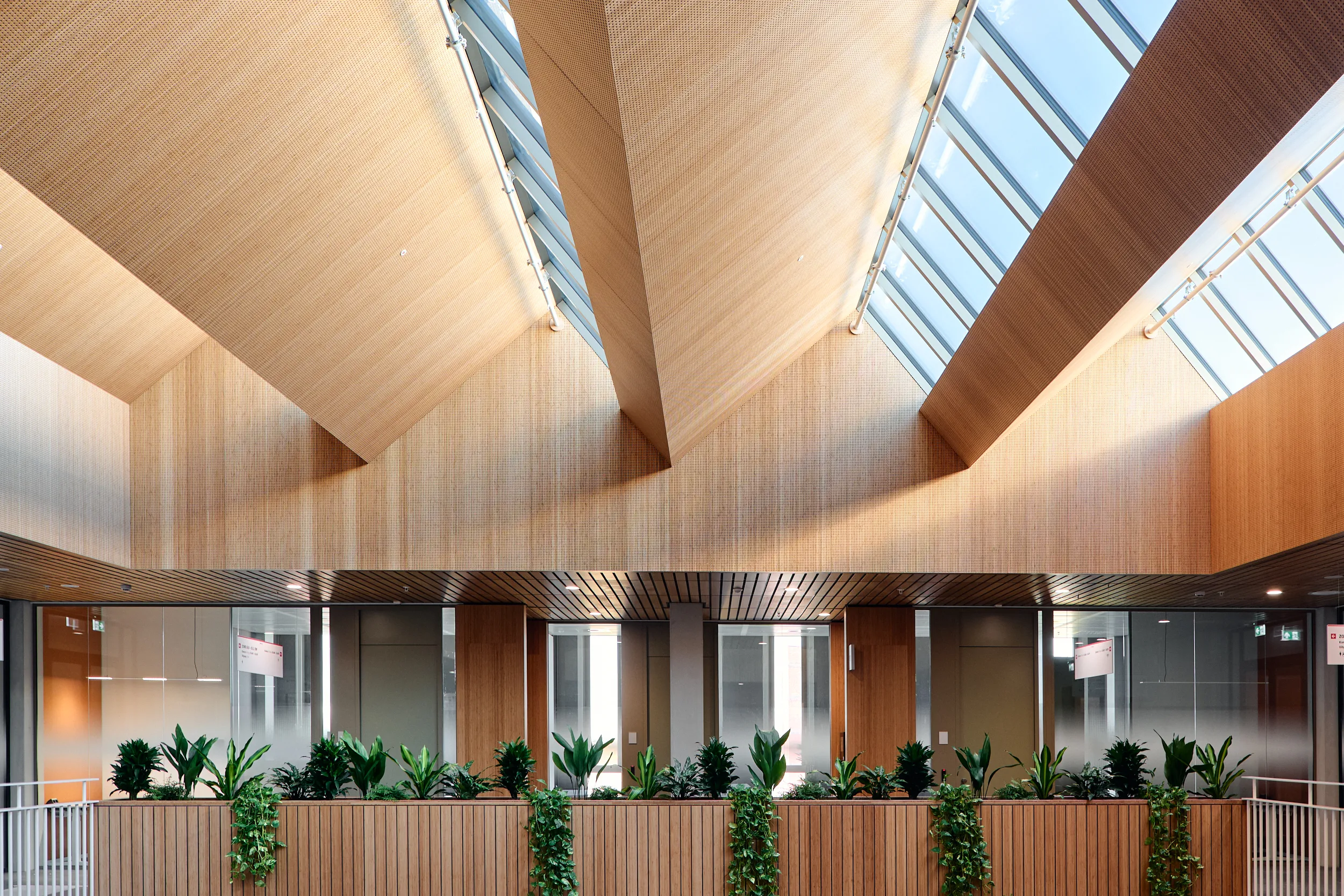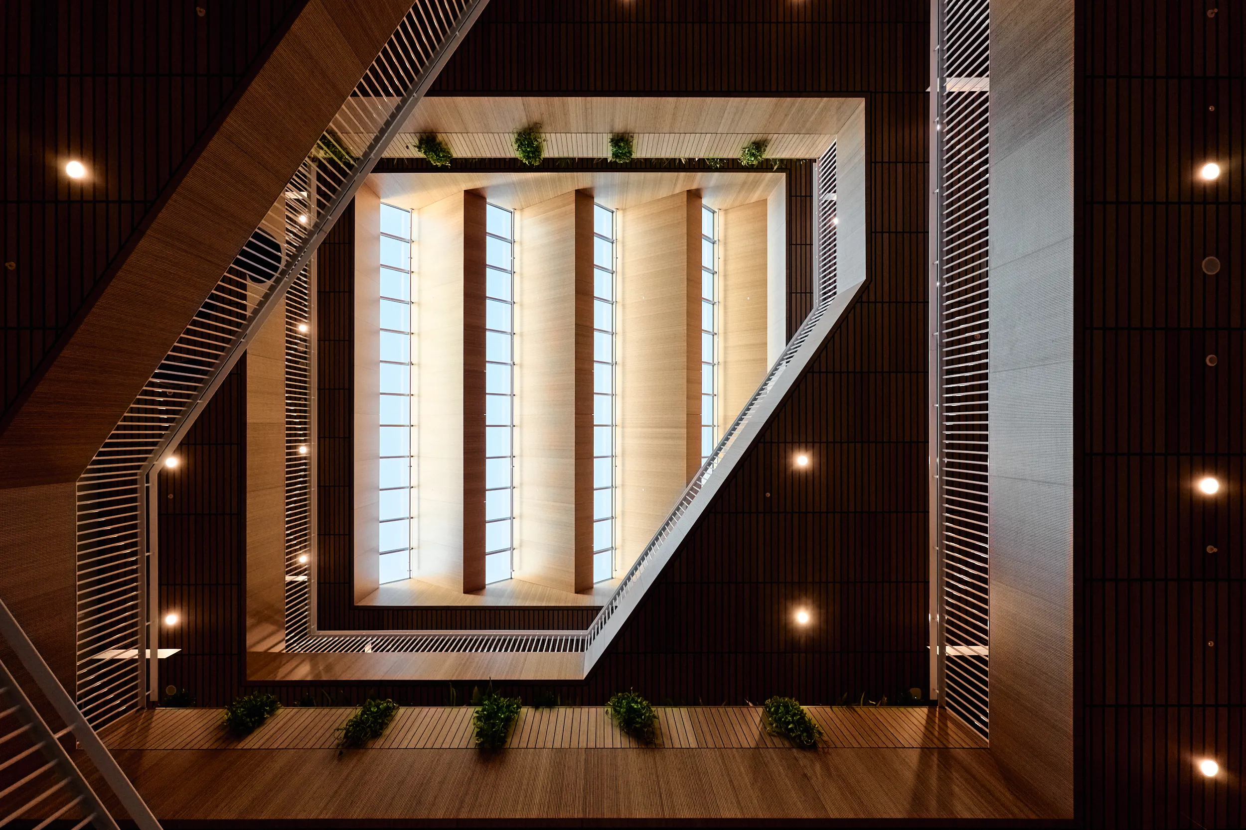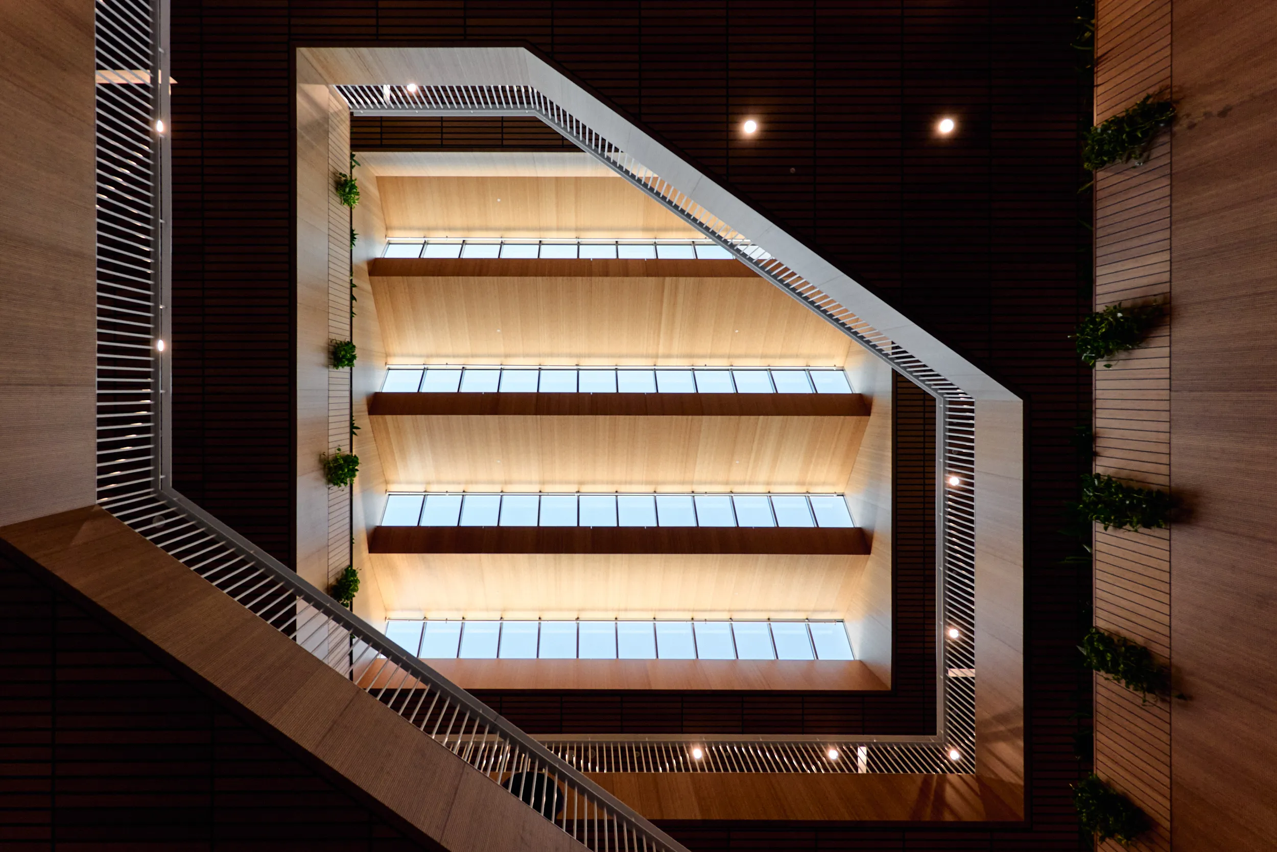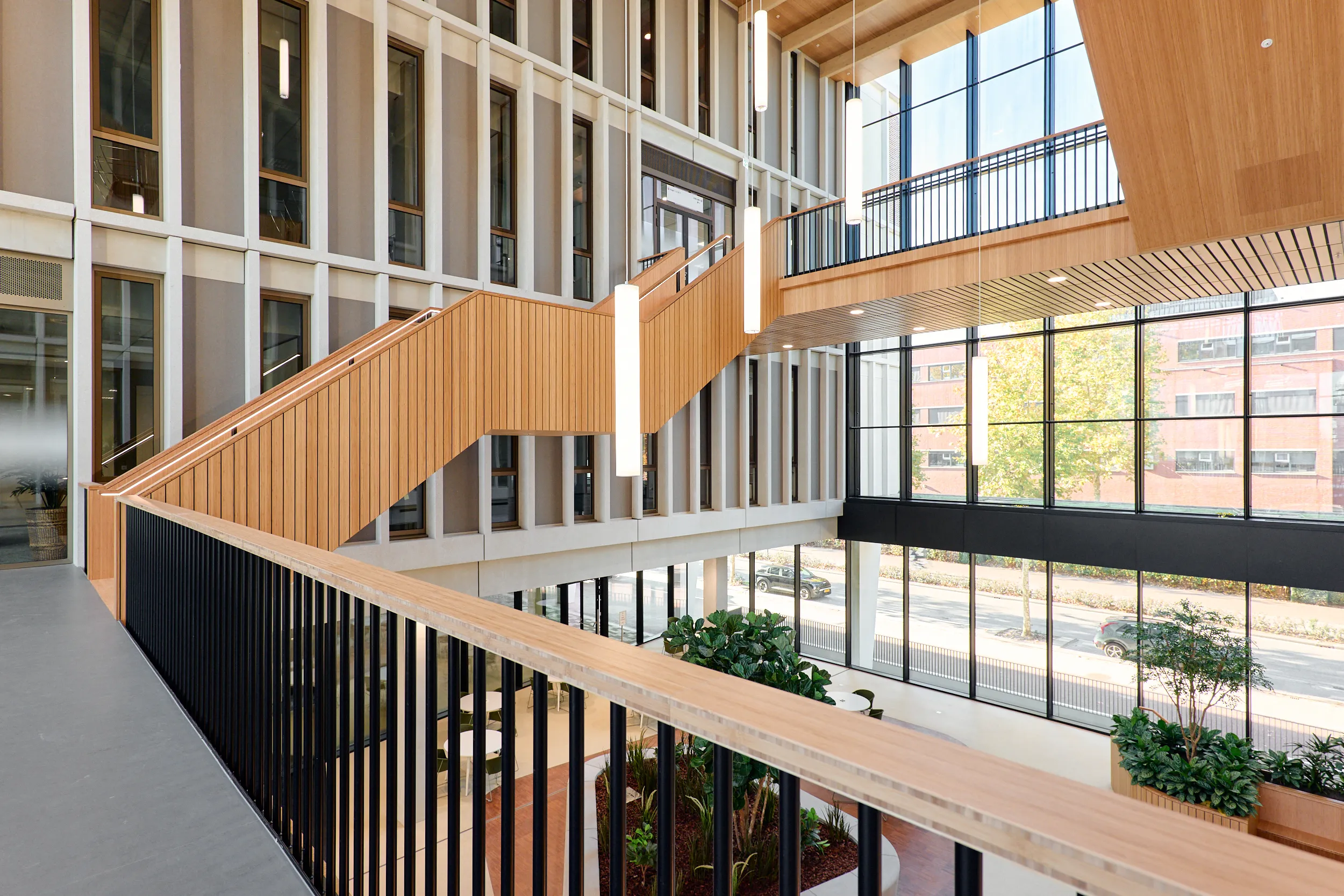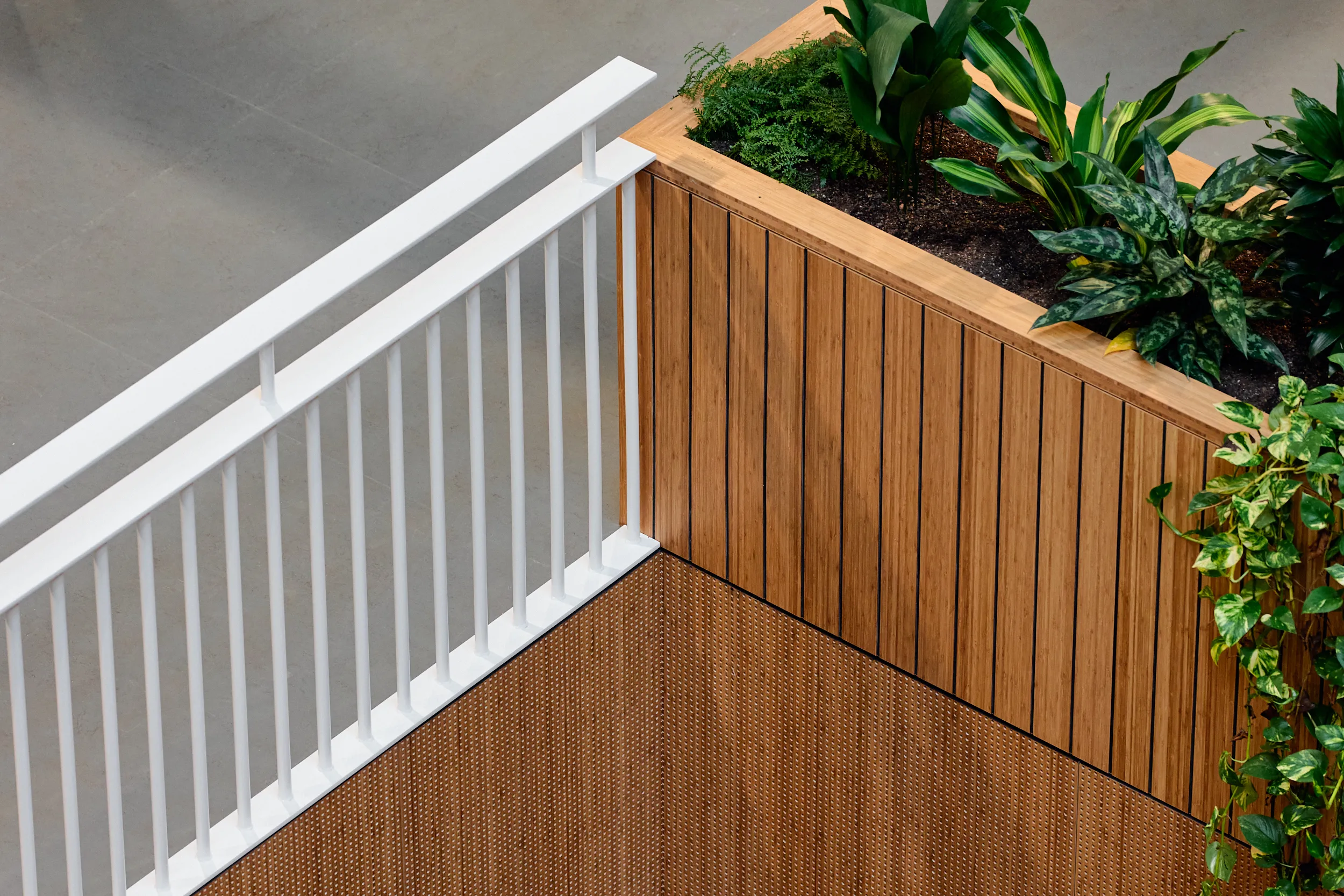 In het atrium is het vakmanschap van onze interieurbouwers duidelijk zichtbaar. De volledige wand- en trapbekleding is door ons op maat geproduceerd en zorgvuldig op locatie gemonteerd. Voor de materialisering kozen we ook hier voor massief bamboe en gefineerd plaatmateriaal. De wand- en trapbekleding is een echte eyecatcher: dynamisch, natuurlijk en tot in detail vakkundig afgewerkt.