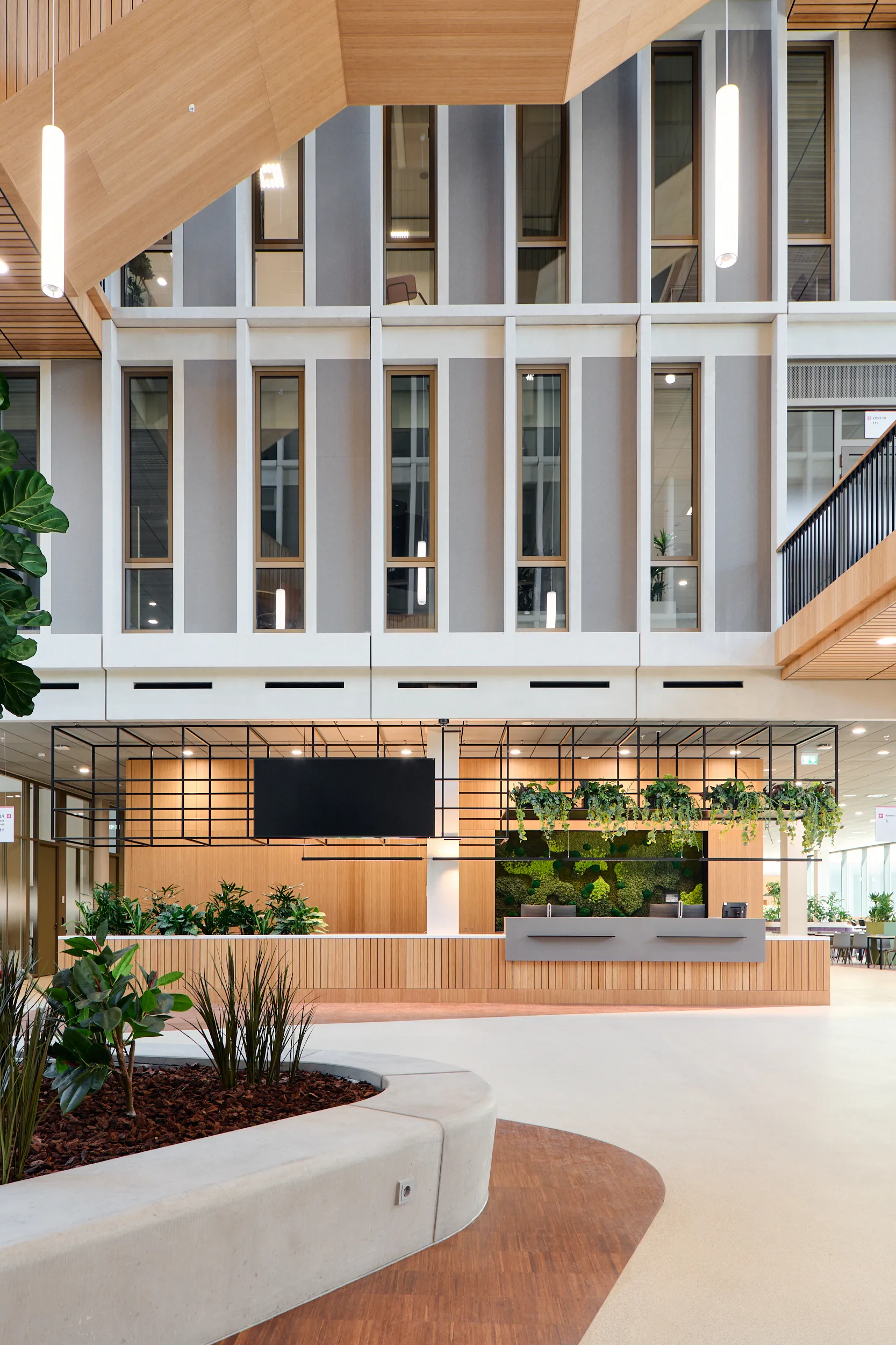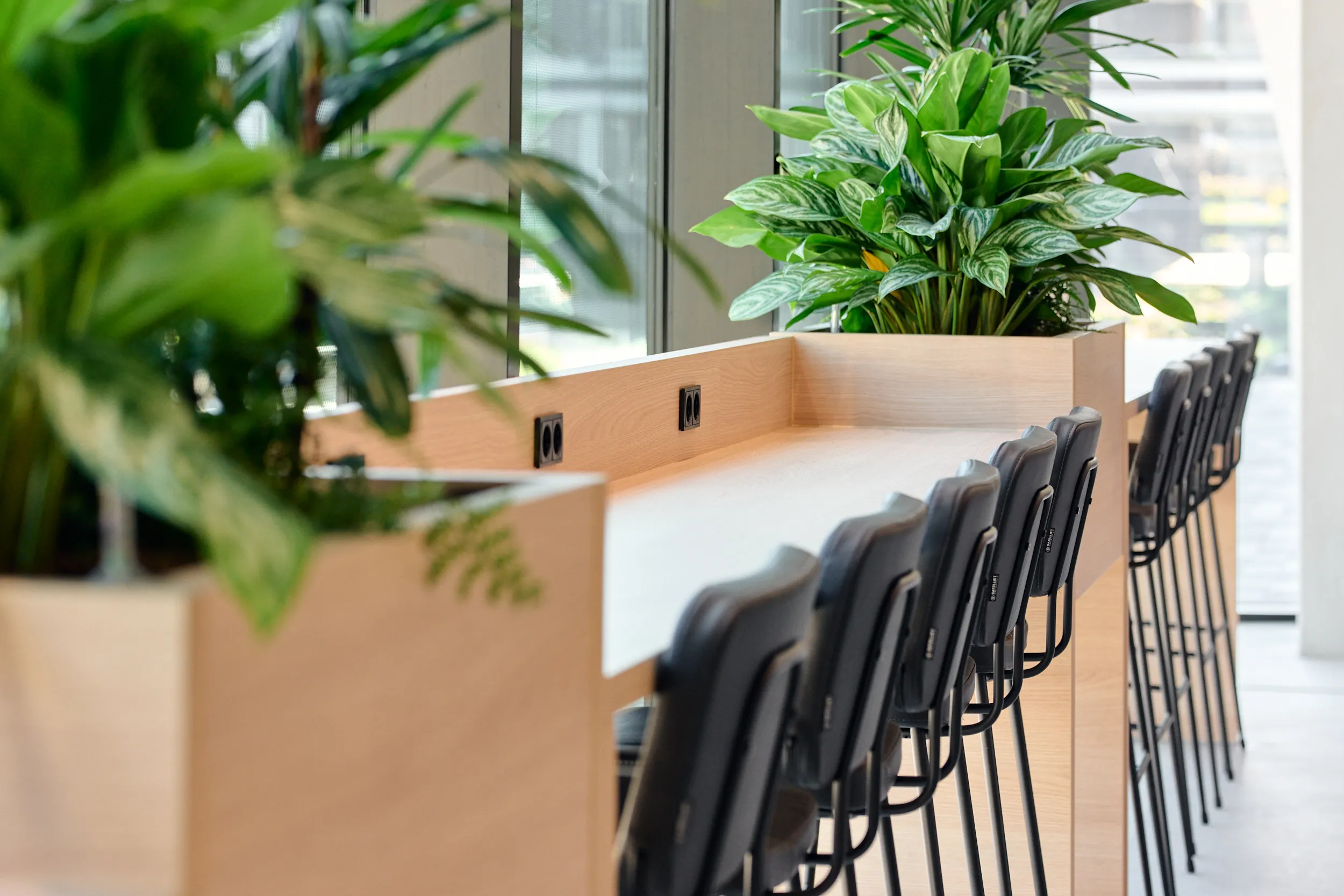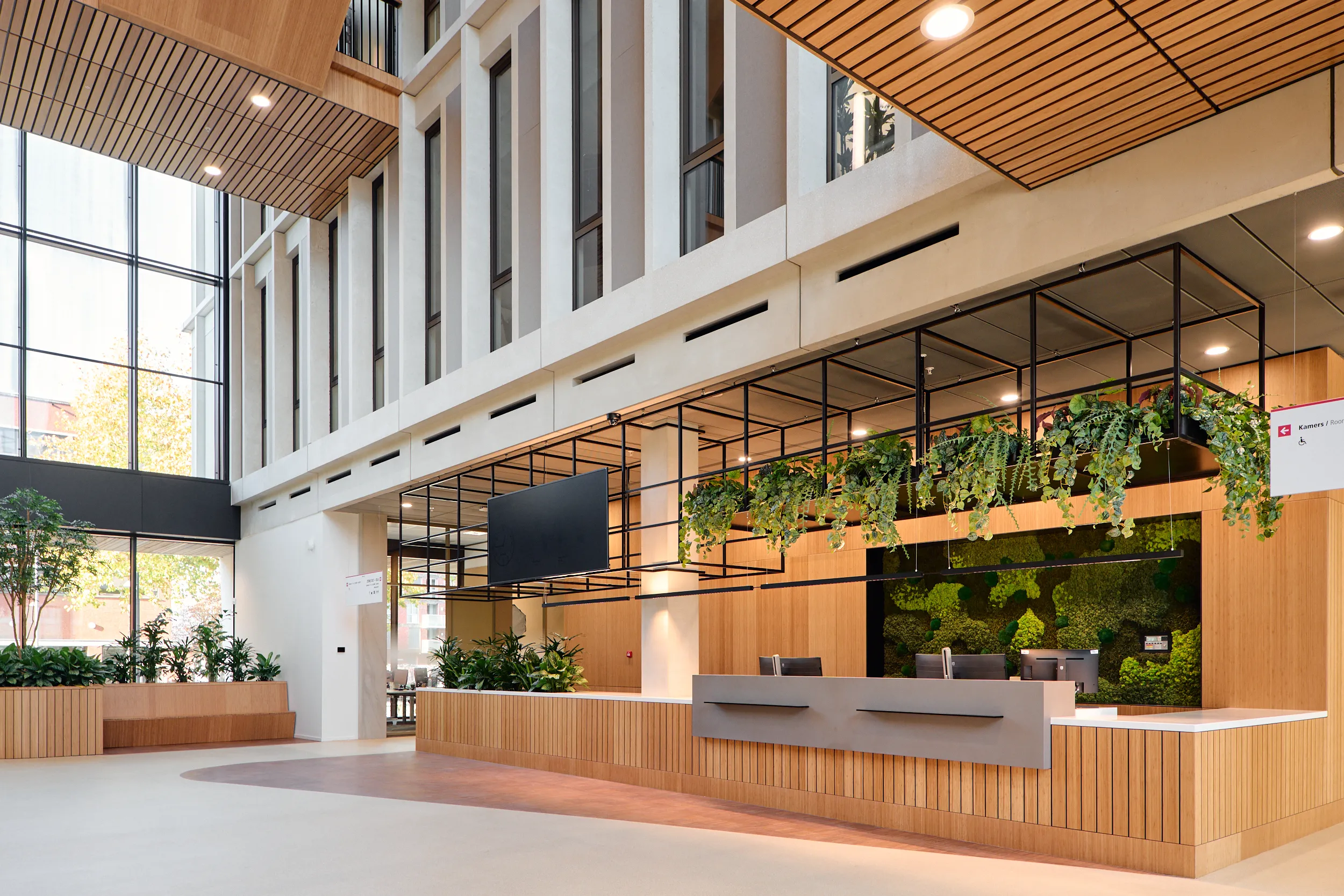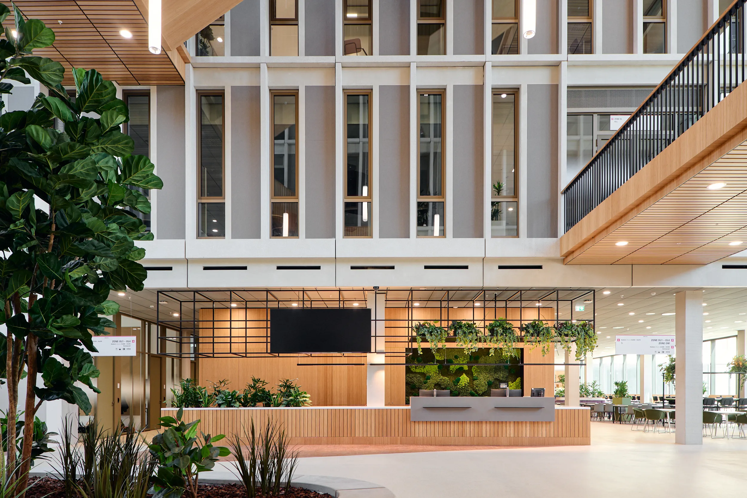 Binnen dit project realiseerden wij al het maatwerkmeubilair voor het entreegebied, de cateringzone en het atrium. Het meubilair is volledig op maat ontworpen voor elke ruimte en optimaal afgestemd op dagelijks gebruik. Voor de uitvoering kozen we voor massief bamboe en gefineerd plaatmateriaal, gecombineerd met PET-felt.