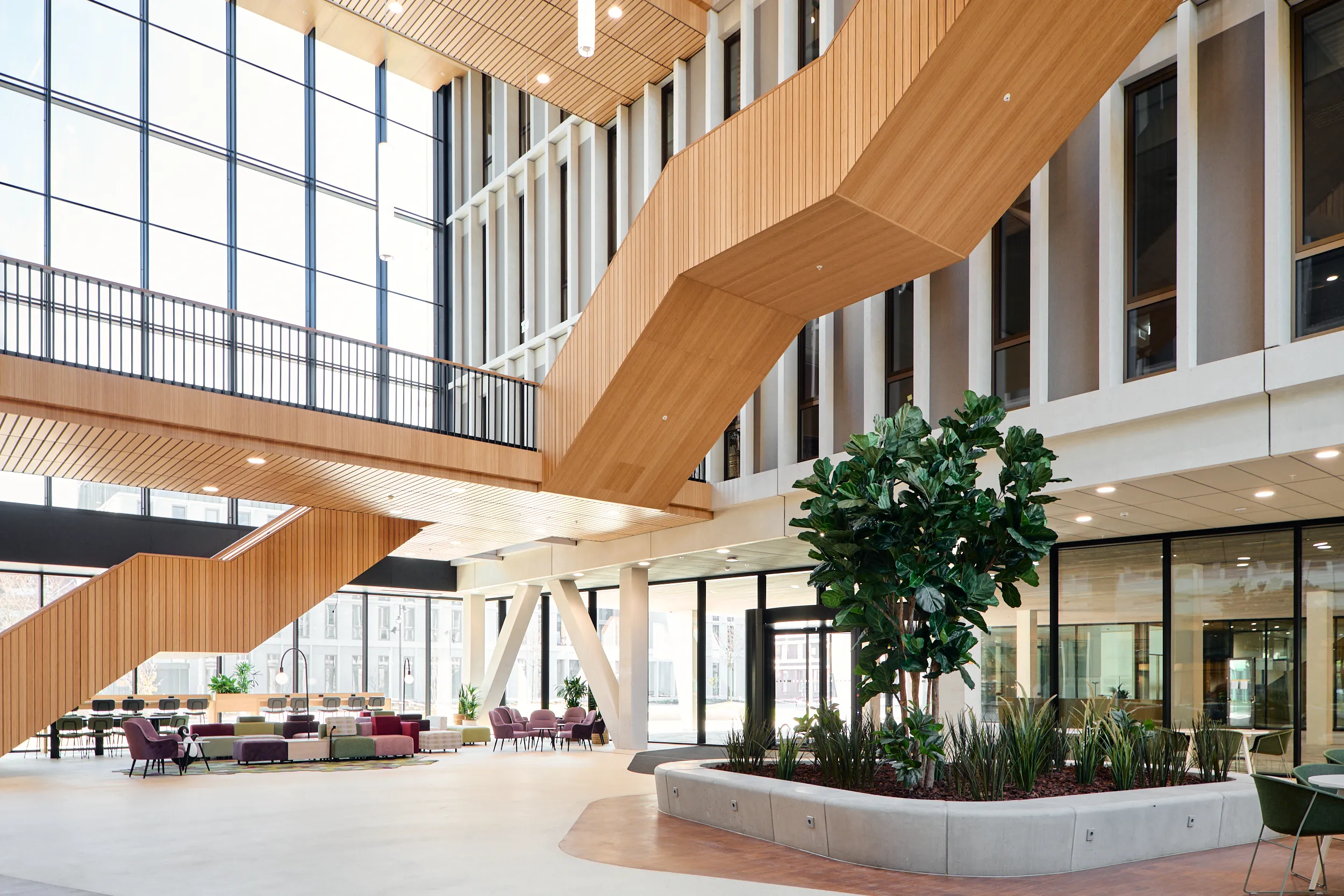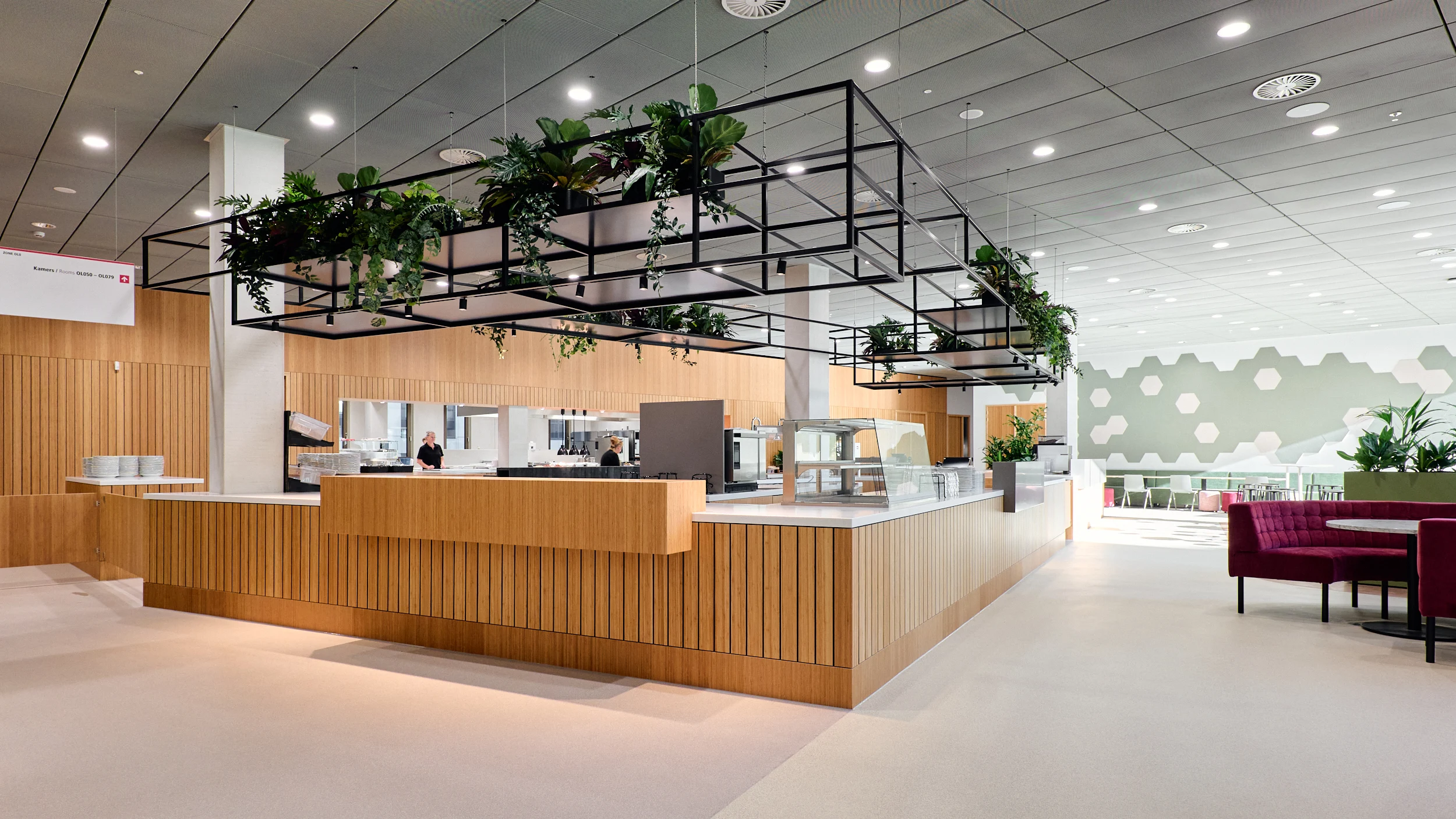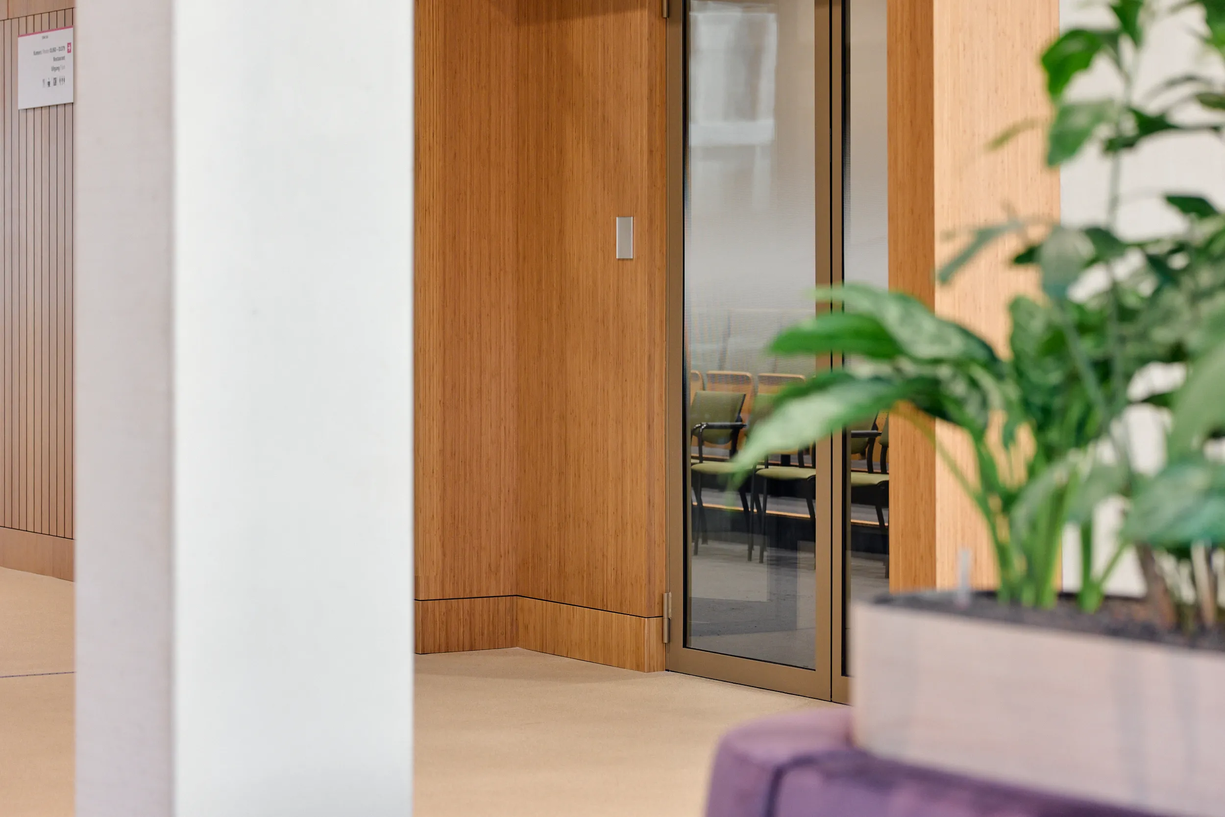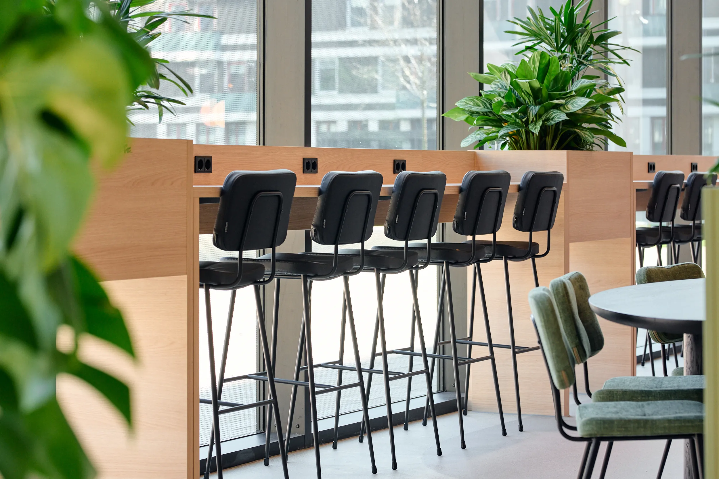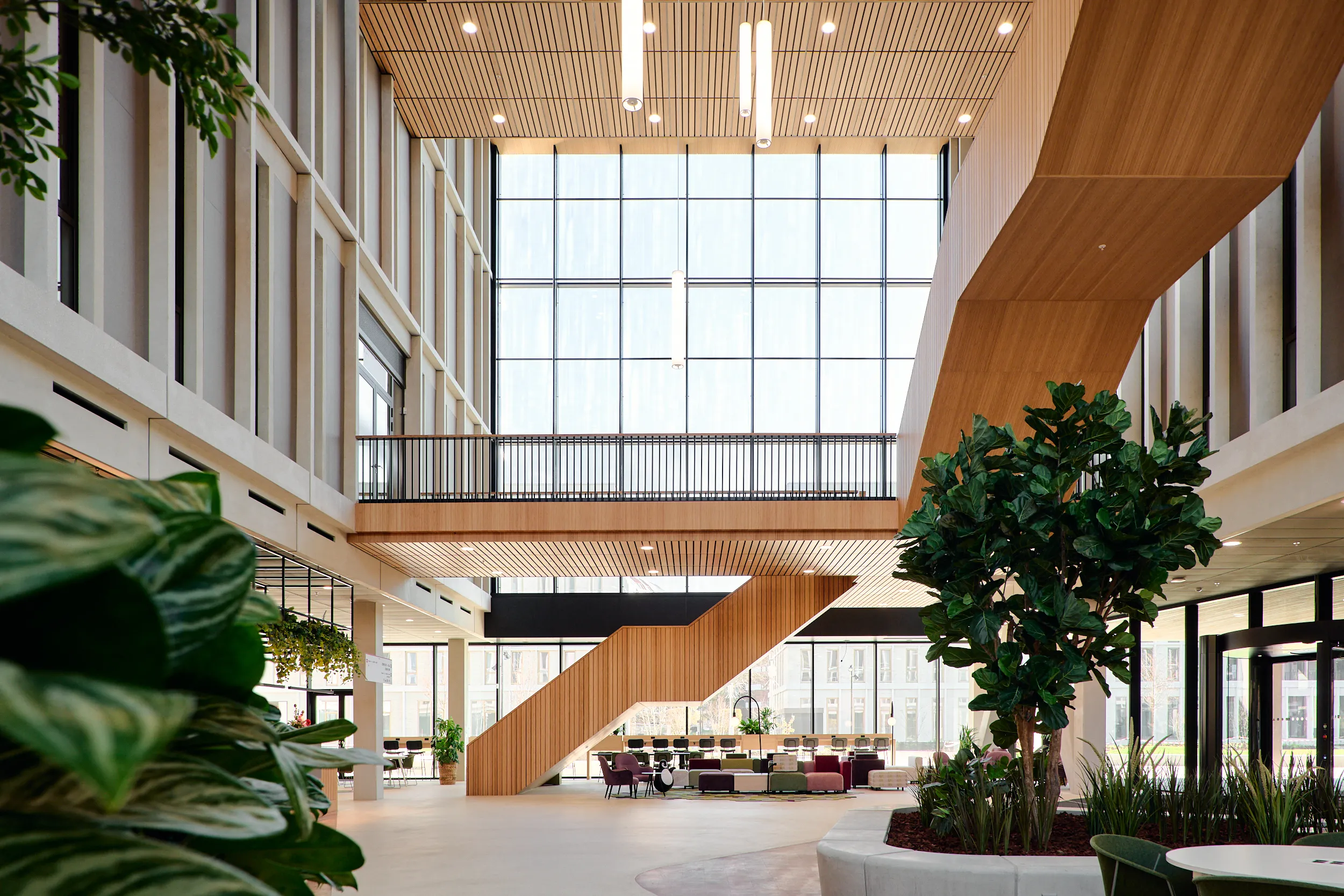 Binnen dit project realiseerden wij al het maatwerkmeubilair voor het entreegebied, de cateringzone en het atrium. Het meubilair is volledig op maat ontworpen voor elke ruimte en optimaal afgestemd op dagelijks gebruik. Voor de uitvoering kozen we voor massief bamboe en gefineerd plaatmateriaal, gecombineerd met PET-felt.