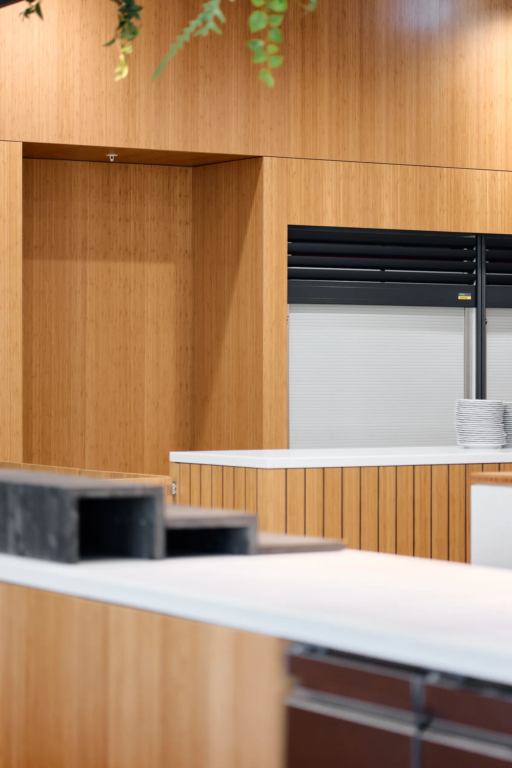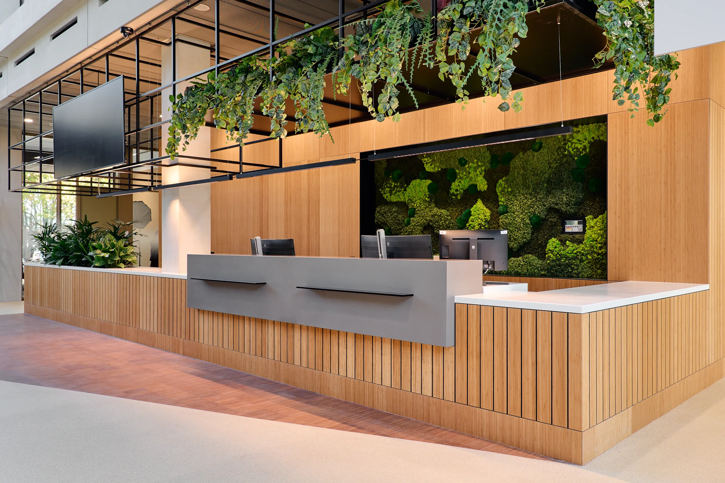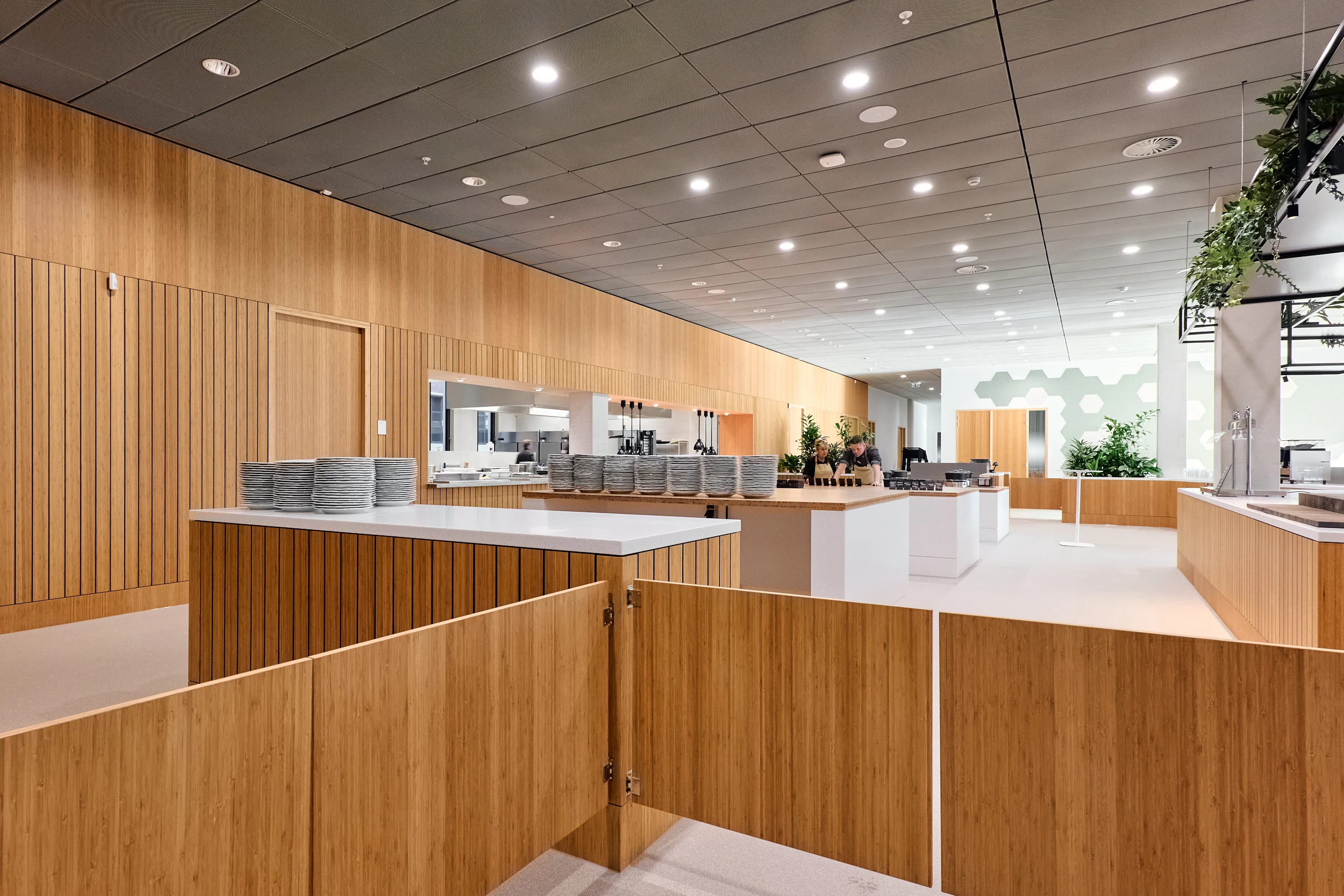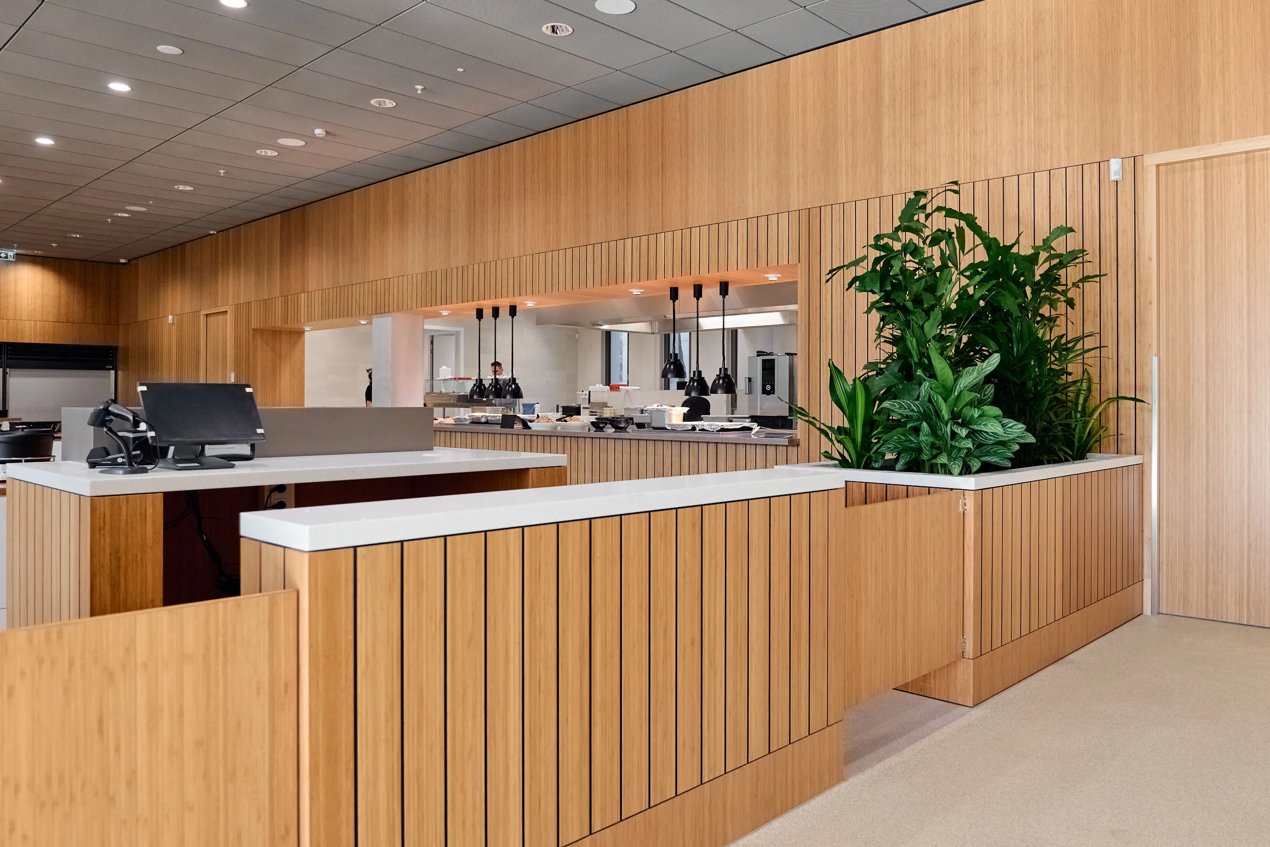 Binnen dit project realiseerden wij al het maatwerkmeubilair voor het entreegebied, de cateringzone en het atrium. Het meubilair is volledig op maat ontworpen voor elke ruimte en optimaal afgestemd op dagelijks gebruik. Voor de uitvoering kozen we voor massief bamboe en gefineerd plaatmateriaal, gecombineerd met PET-felt.