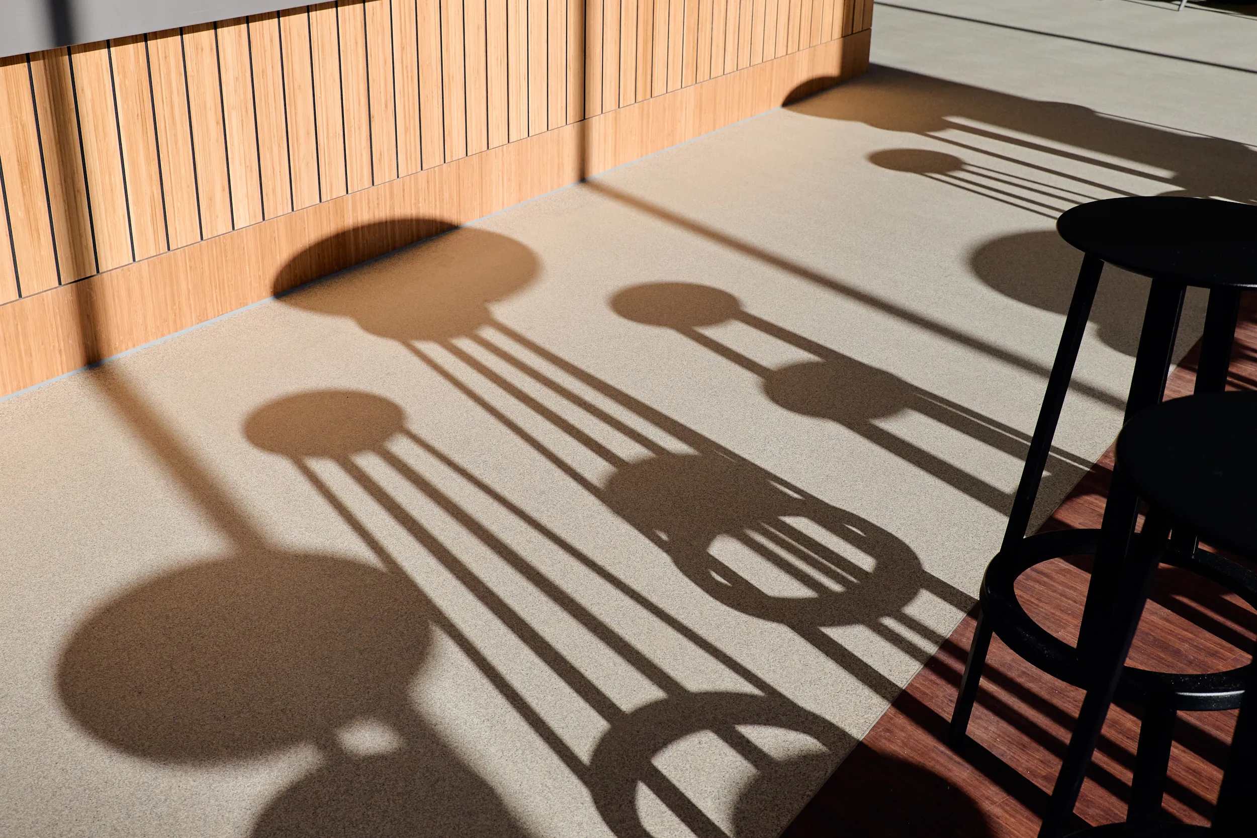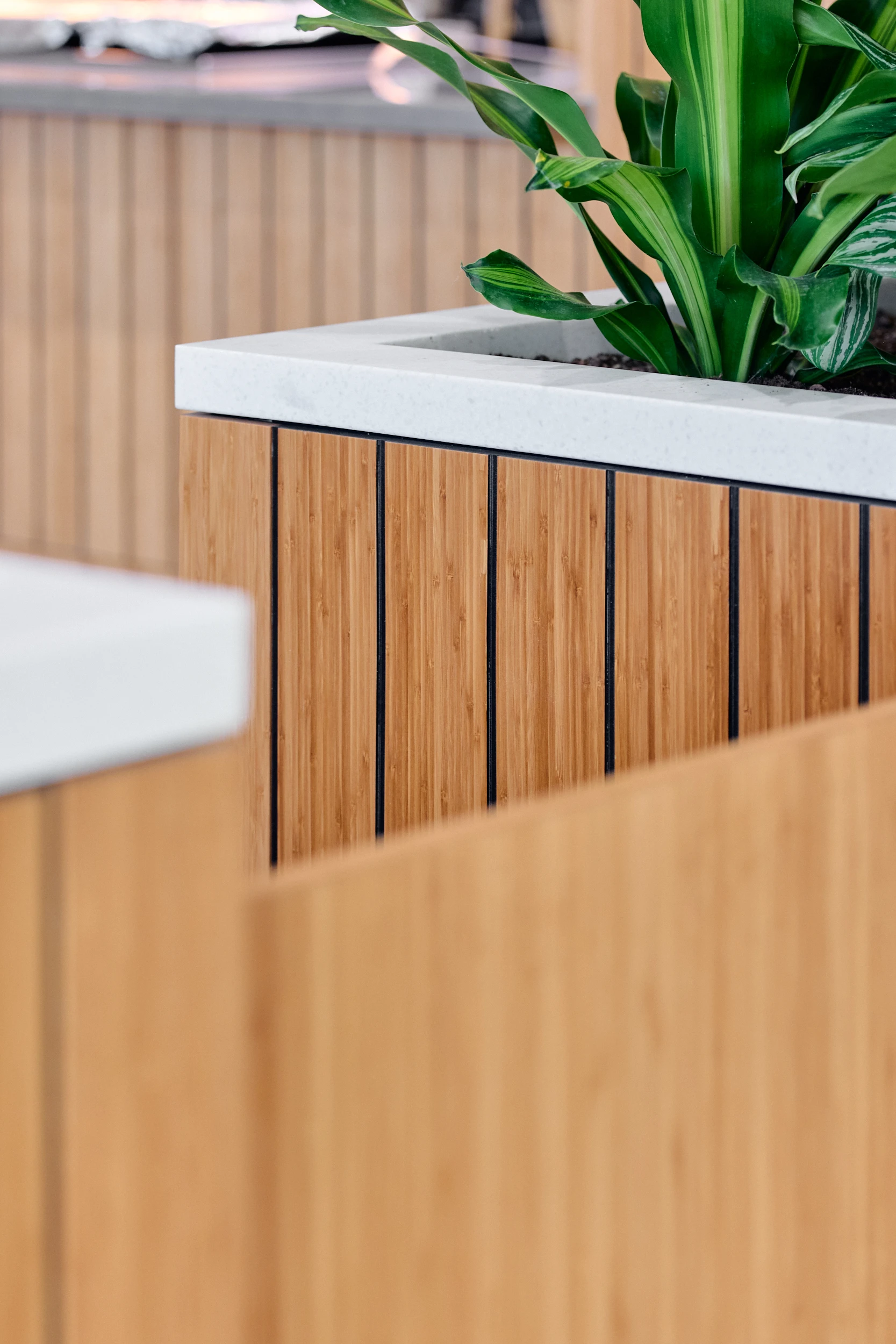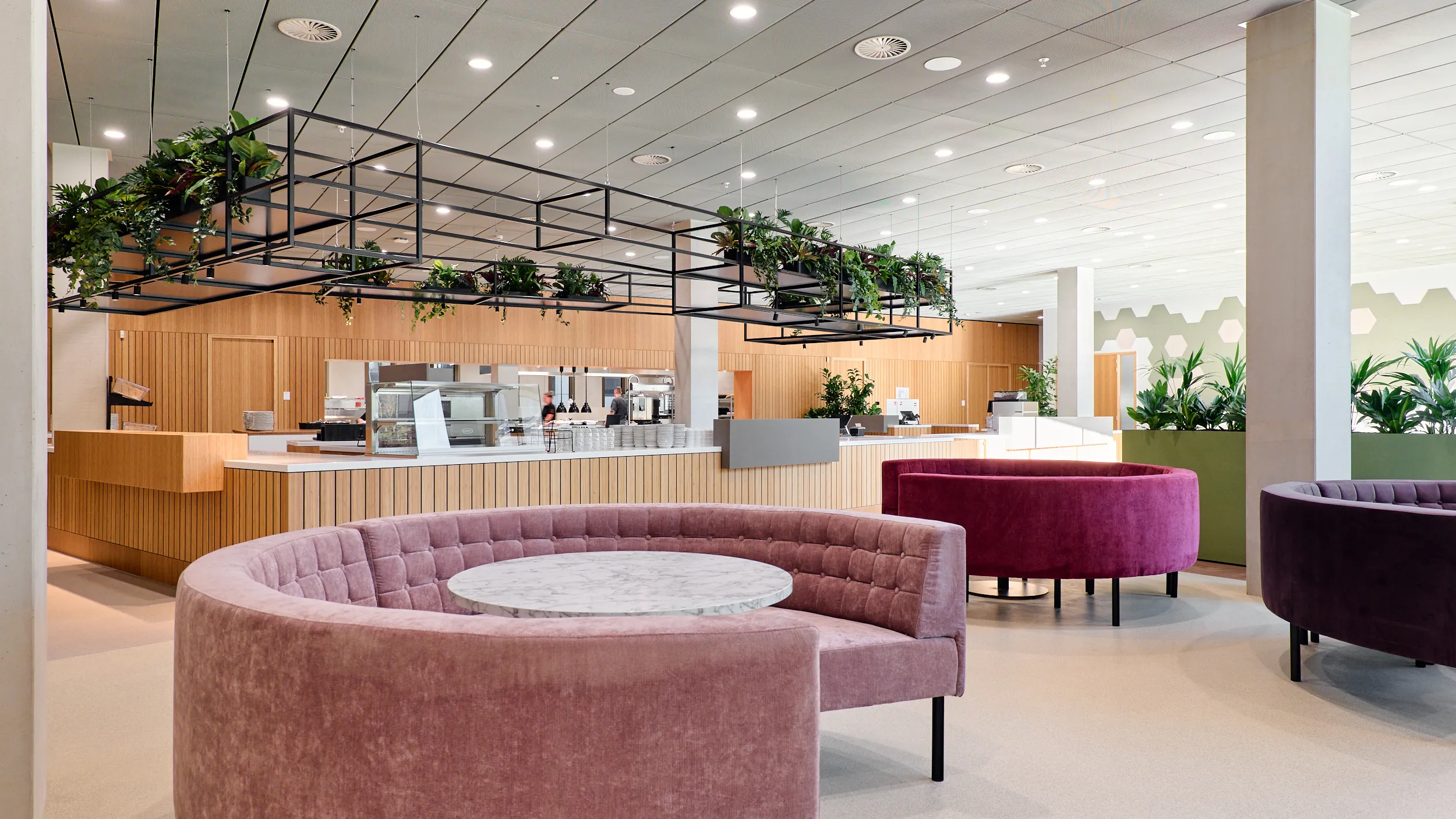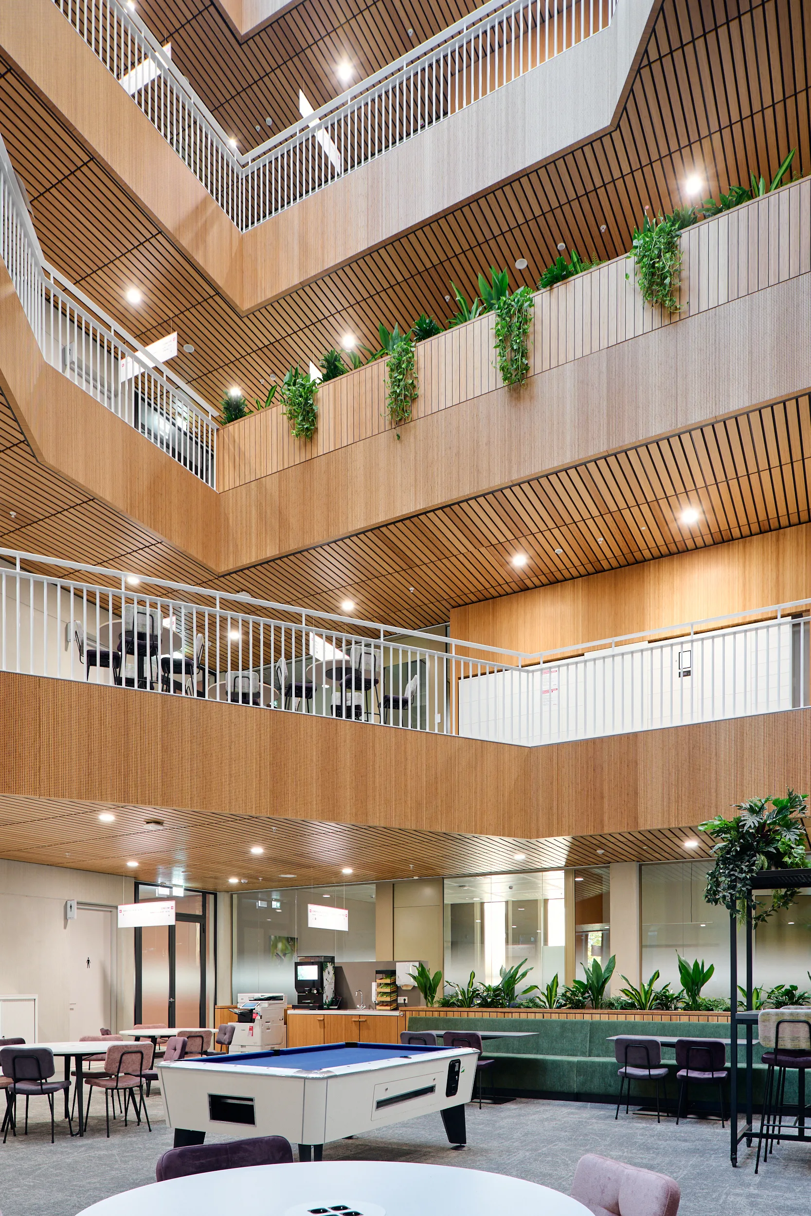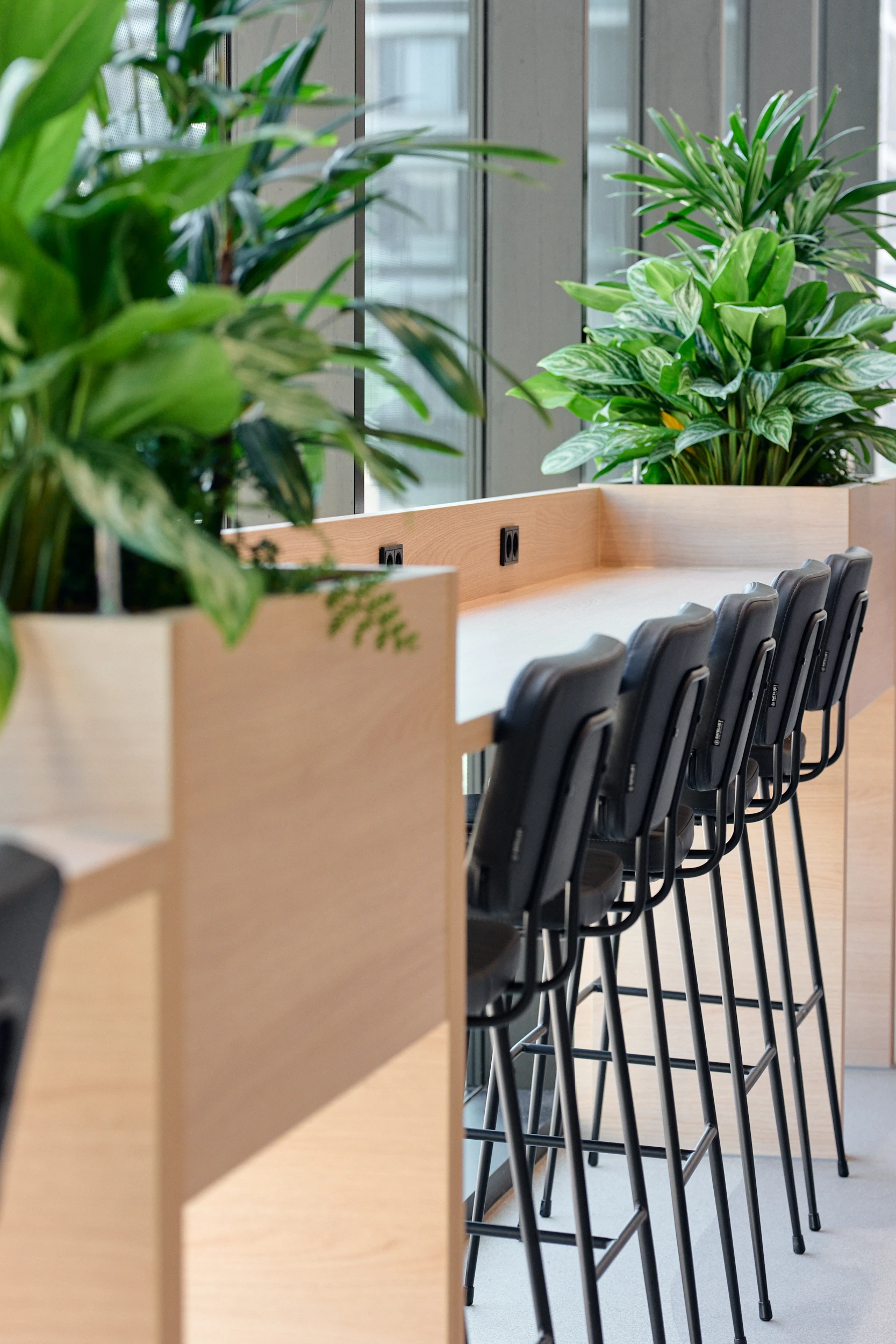 Binnen dit project realiseerden wij al het maatwerkmeubilair voor het entreegebied, de cateringzone en het atrium. Het meubilair is volledig op maat ontworpen voor elke ruimte en optimaal afgestemd op dagelijks gebruik. Voor de uitvoering kozen we voor massief bamboe en gefineerd plaatmateriaal, gecombineerd met PET-felt.