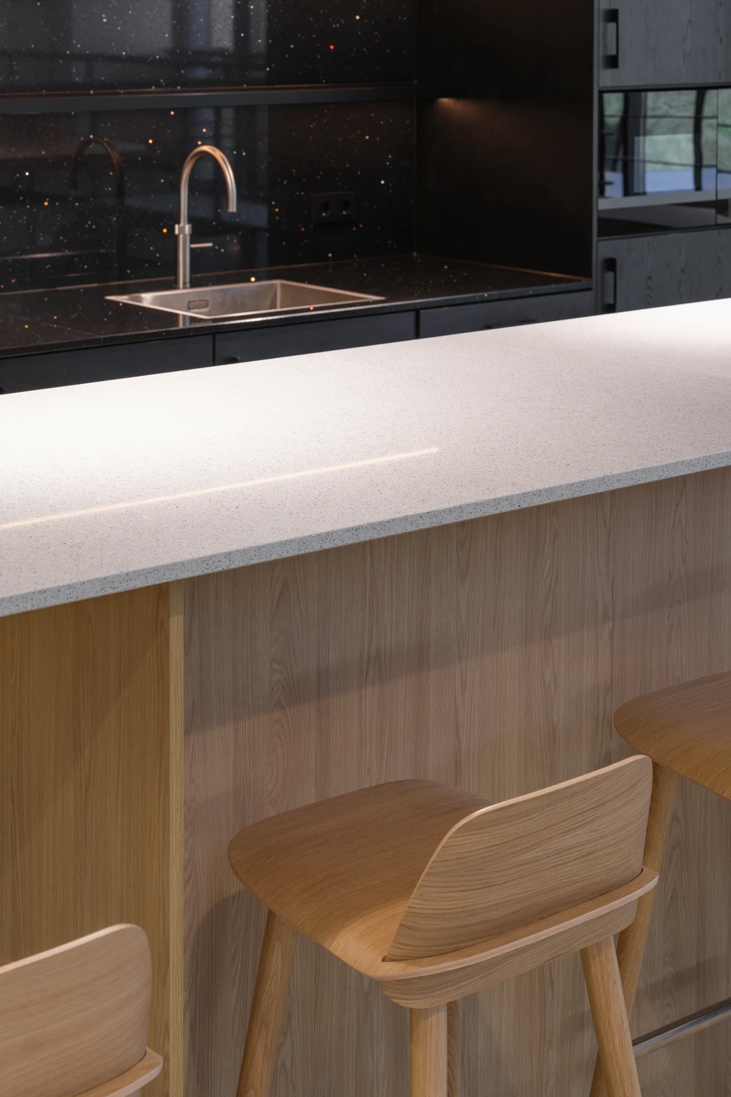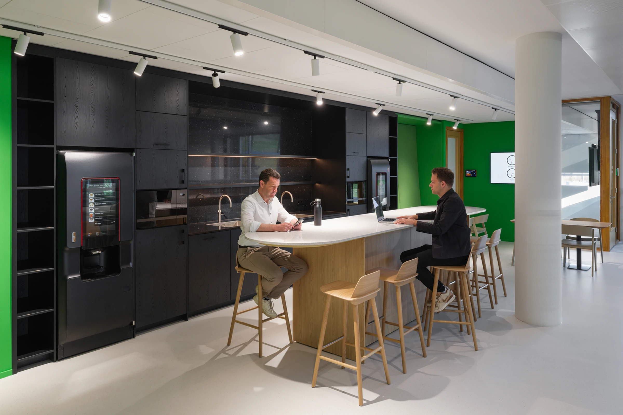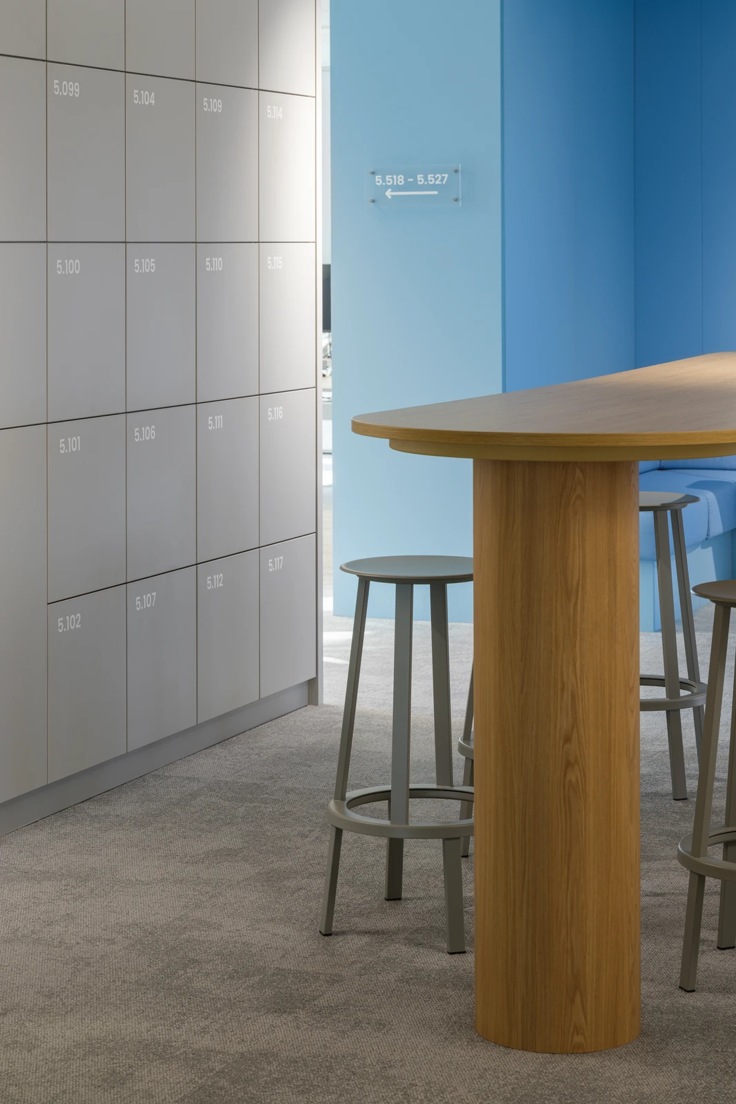 Het project omvatte diverse soorten maatwerk: van pantry’s en lockerwanden tot speciale elementen voor ontvangst- en ontmoetingsruimtes zoals de receptiebalie en de koffiebar. Ieder onderdeel is precies afgestemd op de functie van de ruimte en de wensen van de gebruiker. Door nauwkeurige engineering, zorgvuldige materiaalkeuze en een strakke afstemming in de uitvoering, sluiten alle meubelstukken naadloos aan op de architectuur en installaties van het gebouw.